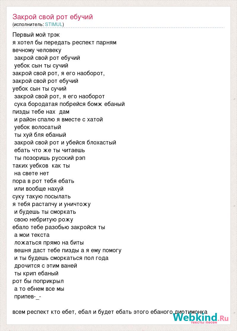 Первый мой трэк я хотел бы передать респект парням вечному человеку закрой свой рот ебучий уебок сын ты сучий закрой свой рот, я его наоборот, закрой свой рот ебучий уебок сын ты сучий закрой свой рот, я его наоборот сука бородатая побрейся бомж ебаный пизды тебе нах дам и район спалю я вместе с хатой уебок волосатый ты хуй бля ебаный закрой свой рот и убейся блохастый ебать что же ты читаешь ты позоришь русский рэп таких уебков как ты на свете нет пора в рот тебя ебать или вообще нахуй суку такую посылать я тебя растапчу и уничтожу и будешь ты сморкать свою небритую рожу ебало тебе разобью закройся ты а мои текста ложаться прямо на биты вешня даст тебе пизды а я ему помогу и ты будешь сморкаться пол года дрочится с этим ваней ты крип ебаный рот бы поприкрыл а то ебнем все мы припев-_- всем респект кто ебет, ебал и будет ебать этого ебаного диртимонка