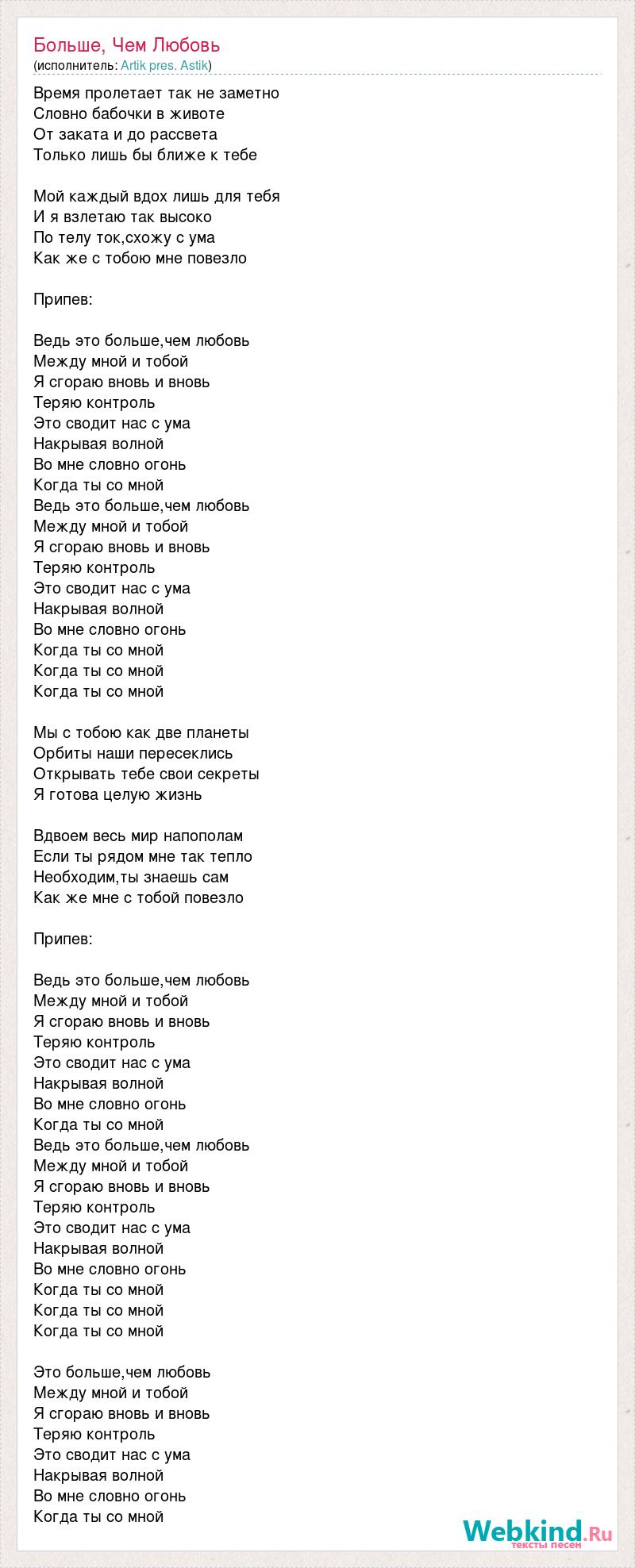Время пролетает так не заметно Словно бабочки в животе От заката и до рассвета Только лишь бы ближе к тебе Мой каждый вдох лишь для тебя И я взлетаю так высоко По телу ток,схожу с ума Как же с тобою мне повезло Припев: Ведь это больше,чем любовь Между мной и тобой Я сгораю вновь и вновь Теряю контроль Это сводит нас с ума Накрывая волной Во мне словно огонь Когда ты со мной Ведь это больше,чем любовь Между мной и тобой Я сгораю вновь и вновь Теряю контроль Это сводит нас с ума Накрывая волной Во мне словно огонь Когда ты со мной Когда ты со мной Когда ты со мной Мы с тобою как две планеты Орбиты наши пересеклись Открывать тебе свои секреты Я готова целую жизнь Вдвоем весь мир напополам Если ты рядом мне так тепло Необходим,ты знаешь сам Как же мне с тобой повезло Припев: Ведь это больше,чем любовь Между мной и тобой Я сгораю вновь и вновь Теряю контроль Это сводит нас с ума Накрывая волной Во мне словно огонь Когда ты со мной Ведь это больше,чем любовь Между мной и тобой Я сгораю вновь и вновь Теряю контроль Это сводит нас с ума Накрывая волной Во мне словно огонь Когда ты со мной Когда ты со мной Когда ты со мной Это больше,чем любовь Между мной и тобой Я сгораю вновь и вновь Теряю контроль Это сводит нас с ума Накрывая волной Во мне словно огонь Когда ты со мной