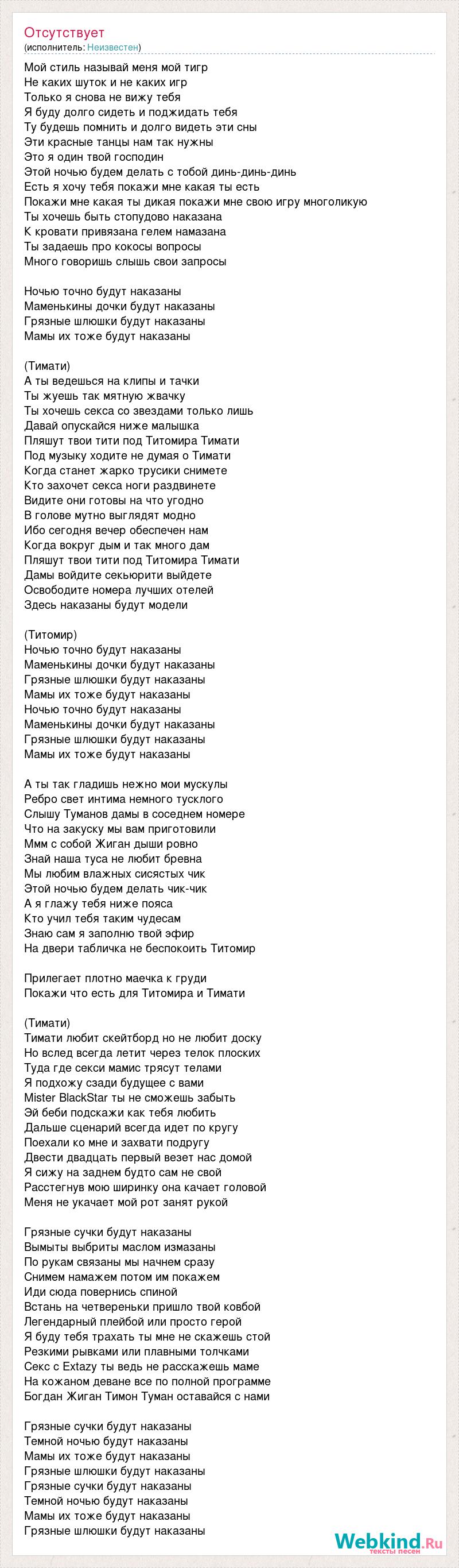 Мой стиль называй меня мой тигр Не каких шуток и не каких игр Только я снова не вижу тебя Я буду долго сидеть и поджидать тебя Ту будешь помнить и долго видеть эти сны Эти красные танцы нам так нужны Это я один твой господин Этой ночью будем делать с тобой динь-динь-динь Есть я хочу тебя покажи мне какая ты есть Покажи мне какая ты дикая покажи мне свою игру многоликую Ты хочешь быть стопудово наказана К кровати привязана гелем намазана Ты задаешь про кокосы вопросы Много говоришь слышь свои запросы Ночью точно будут наказаны Маменькины дочки будут наказаны Грязные шлюшки будут наказаны Мамы их тоже будут наказаны (Тимати) А ты ведешься на клипы и тачки Ты жуешь так мятную жвачку Ты хочешь секса со звездами только лишь Давай опускайся ниже малышка Пляшут твои тити под Титомира Тимати Под музыку ходите не думая о Тимати Когда станет жарко трусики снимете Кто захочет секса ноги раздвинете Видите они готовы на что угодно В голове мутно выглядят модно Ибо сегодня вечер обеспечен нам Когда вокруг дым и так много дам Пляшут твои тити под Титомира Тимати Дамы войдите секьюрити выйдете Освободите номера лучших отелей Здесь наказаны будут модели (Титомир) Ночью точно будут наказаны Маменькины дочки будут наказаны Грязные шлюшки будут наказаны Мамы их тоже будут наказаны Ночью точно будут наказаны Маменькины дочки будут наказаны Грязные шлюшки будут наказаны Мамы их тоже будут наказаны А ты так гладишь нежно мои мускулы Ребро свет интима немного тусклого Слышу Туманов дамы в соседнем номере Что на закуску мы вам приготовили Ммм с собой Жиган дыши ровно Знай наша туса не любит бревна Мы любим влажных сисястых чик Этой ночью будем делать чик-чик А я глажу тебя ниже пояса Кто учил тебя таким чудесам Знаю сам я заполню твой эфир На двери табличка не беспокоить Титомир Прилегает плотно маечка к груди Покажи что есть для Титомира и Тимати (Тимати) Тимати любит скейтборд но не любит доску Но вслед всегда летит через телок плоских Туда где секси мамис трясут телами Я подхожу сзади будущее с вами Mister BlackStar ты не сможешь забыть Эй беби подскажи как тебя любить Дальше сценарий всегда идет по кругу Поехали ко мне и захвати подругу Двести двадцать первый везет нас домой Я сижу на заднем будто сам не свой Расстегнув мою ширинку она качает головой Меня не укачает мой рот занят рукой Грязные сучки будут наказаны Вымыты выбриты маслом измазаны По рукам связаны мы начнем сразу Снимем намажем потом им покажем Иди сюда повернись спиной Встань на четвереньки пришло твой ковбой Легендарный плейбой или просто герой Я буду тебя трахать ты мне не скажешь стой Резкими рывками или плавными толчками Секс с Extazy ты ведь не расскажешь маме На кожаном деване все по полной программе Богдан Жиган Тимон Туман оставайся с нами Грязные сучки будут наказаны Темной ночью будут наказаны Мамы их тоже будут наказаны Грязные шлюшки будут наказаны Грязные сучки будут наказаны Темной ночью будут наказаны Мамы их тоже будут наказаны Грязные шлюшки будут наказаны