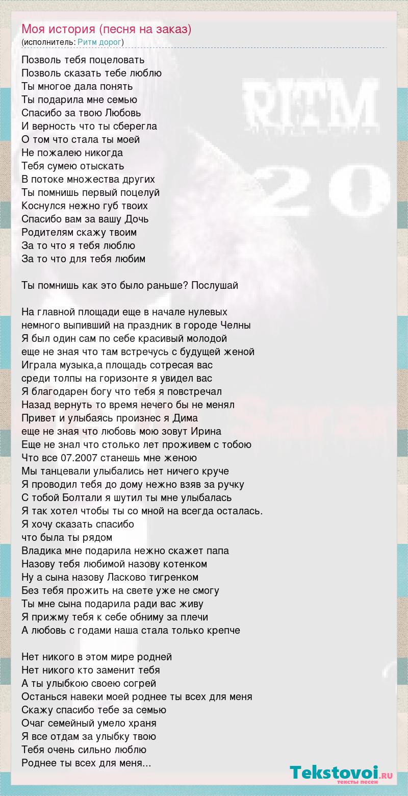 Позволь тебя поцеловать Позволь сказать тебе люблю Ты многое дала понять Ты подарила мне семью Спасибо за твою Любовь И верность что ты сберегла О том что стала ты моей Не пожалею никогда Тебя сумею отыскать В потоке множества других Ты помнишь первый поцелуй Коснулся нежно губ твоих Спасибо вам за вашу Дочь Родителям скажу твоим За то что я тебя люблю За то что для тебя любим Ты помнишь как это было раньше? Послушай На главной площади еще в начале нулевых немного выпивший на праздник в городе Челны Я был один сам по себе красивый молодой еще не зная что там встречусь с будущей женой Играла музыка,а площадь сотресая вас среди толпы на горизонте я увидел вас Я благодарен богу что тебя я повстречал Назад вернуть то время нечего бы не менял Привет и улыбаясь произнес я Дима еще не зная что любовь мою зовут Ирина Еще не знал что столько лет проживем с тобою Что все 07.2007 станешь мне женою Мы танцевали улыбались нет ничего круче Я проводил тебя до дому нежно взяв за ручку С тобой Болтали я шутил ты мне улыбалась Я так хотел чтобы ты со мной на всегда осталась. Я хочу сказать спасибо что была ты рядом Владика мне подарила нежно скажет папа Назову тебя любимой назову котенком Ну а сына назову Ласково тигренком Без тебя прожить на свете уже не смогу Ты мне сына подарила ради вас живу Я прижму тебя к себе обниму за плечи А любовь с годами наша стала только крепче Нет никого в этом мире родней Нет никого кто заменит тебя А ты улыбкою своею согрей Останься навеки моей роднее ты всех для меня Скажу спасибо тебе за семью Очаг семейный умело храня Я все отдам за улыбку твою Тебя очень сильно люблю Роднее ты всех для меня...