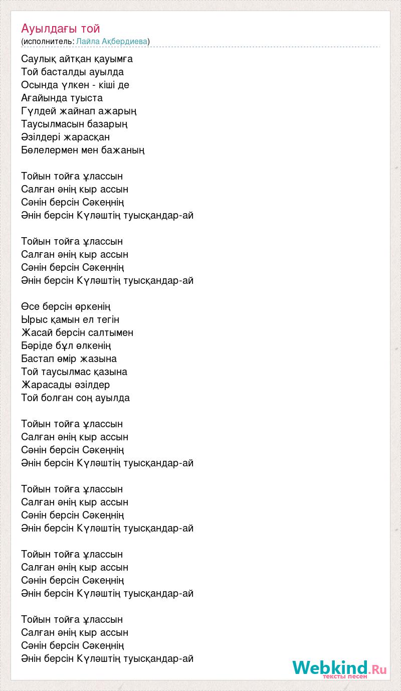 Саулық айтқан қауымға Той басталды ауылда Осында үлкен - кіші де Ағайында туыста Гүлдей жайнап ажарың Таусылмасын базарың Әзілдері жарасқан Бөлелермен мен бажаның Тойын тойға ұлассын Салған әнің кыр ассын Сәнін берсін Сәкеңнің Әнін берсін Күләштің туысқандар-ай Тойын тойға ұлассын Салған әнің кыр ассын Сәнін берсін Сәкеңнің Әнін берсін Күләштің туысқандар-ай Өсе берсін өркенің Ырыс қамын ел тегін Жасай берсін салтымен Бәріде бұл өлкенің Бастап өмір жазына Той таусылмас қазына Жарасады әзілдер Той болған соң ауылда Тойын тойға ұлассын Салған әнің кыр ассын Сәнін берсін Сәкеңнің Әнін берсін Күләштің туысқандар-ай Тойын тойға ұлассын Салған әнің кыр ассын Сәнін берсін Сәкеңнің Әнін берсін Күләштің туысқандар-ай Тойын тойға ұлассын Салған әнің кыр ассын Сәнін берсін Сәкеңнің Әнін берсін Күләштің туысқандар-ай Тойын тойға ұлассын Салған әнің кыр ассын Сәнін берсін Сәкеңнің Әнін берсін Күләштің туысқандар-ай