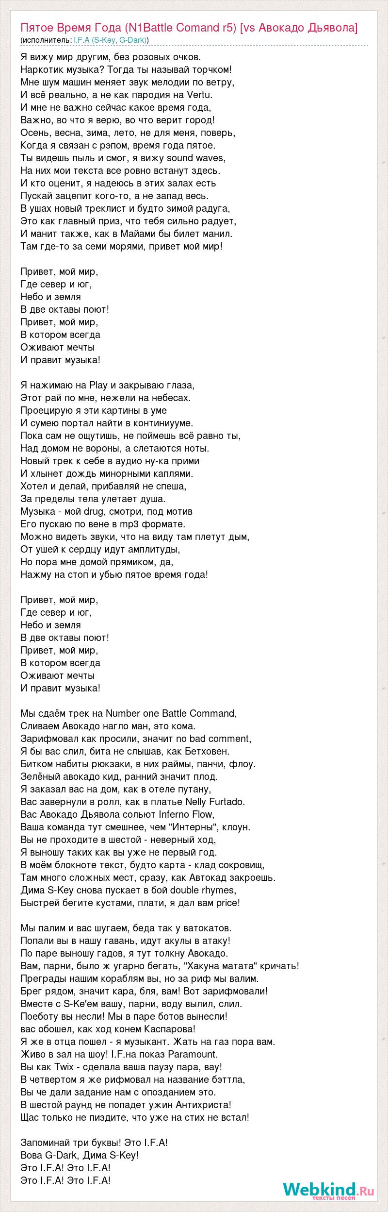 Я вижу мир другим, без розовых очков. Наркотик музыка? Тогда ты называй торчком! Мне шум машин меняет звук мелодии по ветру, И всё реально, а не как пародия на Vertu. И мне не важно сейчас какое время года, Важно, во что я верю, во что верит город! Осень, весна, зима, лето, не для меня, поверь, Когда я связан с рэпом, время года пятое. Ты видешь пыль и смог, я вижу sound waves, На них мои текста все ровно встанут здесь. И кто оценит, я надеюсь в этих залах есть Пускай зацепит кого-то, а не запад весь. В ушах новый треклист и будто зимой радуга, Это как главный приз, что тебя сильно радует, И манит также, как в Майами бы билет манил. Там где-то за семи морями, привет мой мир! Привет, мой мир, Где север и юг, Небо и земля В две октавы поют! Привет, мой мир, В котором всегда Оживают мечты И правит музыка! Я нажимаю на Play и закрываю глаза, Этот рай по мне, нежели на небесах. Проецирую я эти картины в уме И сумею портал найти в континиууме. Пока сам не ощутишь, не поймешь всё равно ты, Над домом не вороны, а слетаются ноты. Новый трек к себе в аудио ну-ка прими И хлынет дождь минорными каплями. Хотел и делай, прибавляй не спеша, За пределы тела улетает душа. Музыка - мой drug, смотри, под мотив Его пускаю по вене в mp3 формате. Можно видеть звуки, что на виду там плетут дым, От ушей к сердцу идут амплитуды, Но пора мне домой прямиком, да, Нажму на стоп и убью пятое время года! Привет, мой мир, Где север и юг, Небо и земля В две октавы поют! Привет, мой мир, В котором всегда Оживают мечты И правит музыка! Мы сдаём трек на Number one Battle Command, Сливаем Авокадо нагло ман, это кома. Зарифмовал как просили, значит no bad comment, Я бы вас слил, бита не слышав, как Бетховен. Битком набиты рюкзаки, в них раймы, панчи, флоу. Зелёный авокадо кид, ранний значит плод. Я заказал вас на дом, как в отеле путану, Вас завернули в ролл, как в платье Nelly Furtado. Вас Авокадо Дьявола сольют Inferno Flow, Ваша команда тут смешнее, чем "Интерны", клоун. Вы не проходите в шестой - неверный ход, Я выношу таких как вы уже не первый год. В моём блокноте текст, будто карта - клад сокровищ, Там много сложных мест, сразу, как Автокад закроешь. Дима S-Key снова пускает в бой double rhymes, Быстрей бегите кустами, плати, я дал вам price! Мы палим и вас шугаем, беда так у ватокатов. Попали вы в нашу гавань, идут акулы в атаку! По паре выношу гадов, я тут толкну Авокадо. Вам, парни, было ж угарно бегать, "Хакуна матата" кричать! Преграды нашим кораблям вы, но за риф мы валим. Брег рядом, значит кара, бля, вам! Вот зарифмовали! Вместе с S-Ke'ем вашу, парни, воду вылил, слил. Поеботу вы несли! Мы в паре ботов вынесли! вас обошел, как ход конем Каспарова! Я же в отца пошел - я музыкант. Жать на газ пора вам. Живо в зал на шоу! I.F.на показ Paramount. Вы как Twix - сделала ваша паузу пара, вау! В четвертом я же рифмовал на название бэттла, Вы че дали задание нам с опозданием это. В шестой раунд не попадет ужин Антихриста! Щас только не пиздите, что уже на стих не встал! Запоминай три буквы! Это I.F.A! Вова G-Dark, Дима S-Key! Это I.F.A! Это I.F.A! Это I.F.A! Это I.F.A!