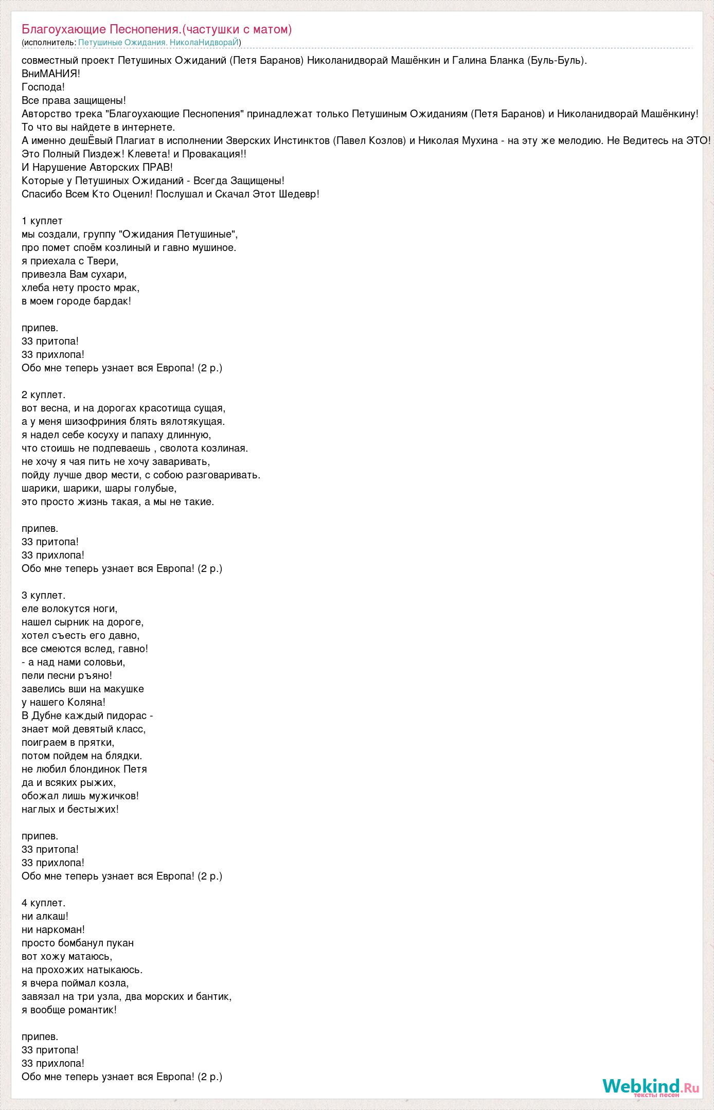 совместный проект Петушиных Ожиданий (Петя Баранов) Николанидворай Машёнкин и Галина Бланка (Буль-Буль). ВниМАНИЯ! Господа! Все права защищены! Авторство трека "Благоухающие Песнопения" принадлежат только Петушиным Ожиданиям (Петя Баранов) и Николанидворай Машёнкину! То что вы найдете в интернете. А именно дешЁвый Плагиат в исполнении Зверских Инстинктов (Павел Козлов) и Николая Мухина - на эту же мелодию. Не Ведитесь на ЭТО! Это Полный Пиздеж! Клевета! и Провакация!! И Нарушение Авторских ПРАВ! Которые у Петушиных Ожиданий - Всегда Защищены! Спасибо Всем Кто Оценил! Послушал и Скачал Этот Шедевр! 1 куплет мы создали, группу "Ожидания Петушиные", про помет споём козлиный и гавно мушиное. я приехала с Твери, привезла Вам сухари, хлеба нету просто мрак, в моем городе бардак! припев. 33 притопа! 33 прихлопа! Обо мне теперь узнает вся Европа! (2 р.) 2 куплет. вот весна, и на дорогах красотища сущая, а у меня шизофриния блять вялотякущая. я надел себе косуху и папаху длинную, что стоишь не подпеваешь , сволота козлиная. не хочу я чая пить не хочу заваривать, пойду лучше двор мести, с собою разговаривать. шарики, шарики, шары голубые, это просто жизнь такая, а мы не такие. припев. 33 притопа! 33 прихлопа! Обо мне теперь узнает вся Европа! (2 р.) 3 куплет. еле волокутся ноги, нашел сырник на дороге, хотел съесть его давно, все смеются вслед, гавно! - а над нами соловьи, пели песни ръяно! завелись вши на макушке у нашего Коляна! В Дубне каждый пидорас - знает мой девятый класс, поиграем в прятки, потом пойдем на блядки. не любил блондинок Петя да и всяких рыжих, обожал лишь мужичков! наглых и бестыжих! припев. 33 притопа! 33 прихлопа! Обо мне теперь узнает вся Европа! (2 р.) 4 куплет. ни алкаш! ни наркоман! просто бомбанул пукан вот хожу матаюсь, на прохожих натыкаюсь. я вчера поймал козла, завязал на три узла, два морских и бантик, я вообще романтик! припев. 33 притопа! 33 прихлопа! Обо мне теперь узнает вся Европа! (2 р.)