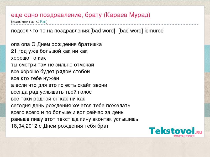 подсел что-то на поздравления:[bad word] [bad word] idmurod опа опа С Днем рождения братишка 21 год уже большой как ни как хорошо то как ты смотри там не сильно отмечай все хорошо будет рядом стобой все кто тебе нужен а если что для это го есть скайп звони всегда рад услышать твой голос все таки родной он как ни как сегодня день рождения хочется тебе пожелать всего всего и по больше и вот сейчас за день раньше пишу этот текст ща кину вконтак услышишь 18,04,2012 с Днем рождения тебя брат