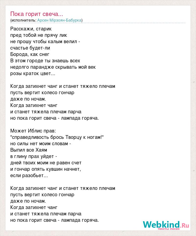 Расскажи, старик пред тобой не прячу лик не прошу чтобы калым велил - счастье будет-ли Борода, как снег В этом городе ты знаешь всех недолго парандже скрывать мой век розы краток цвет... Когда затихнет чанг и станет тяжело плечам пусть вертит колесо гончар даже по ночам. Когда затихнет чанг и станет тяжела плечам парча но пока горит свеча - лампада горяча. Может Иблис прав: "справедливость брось Творцу к ногам!" но силы нет моим словам - Выпил все Хаям в глину прах уйдет - дней твоих моим не равен счет и гончар опять кувшин начнет, если разобьет... Когда затихнет чанг и станет тяжело плечам пусть вертит колесо гончар даже по ночам. Когда затихнет чанг и станет тяжела плечам парча но пока горит свеча - лампада горяча.
