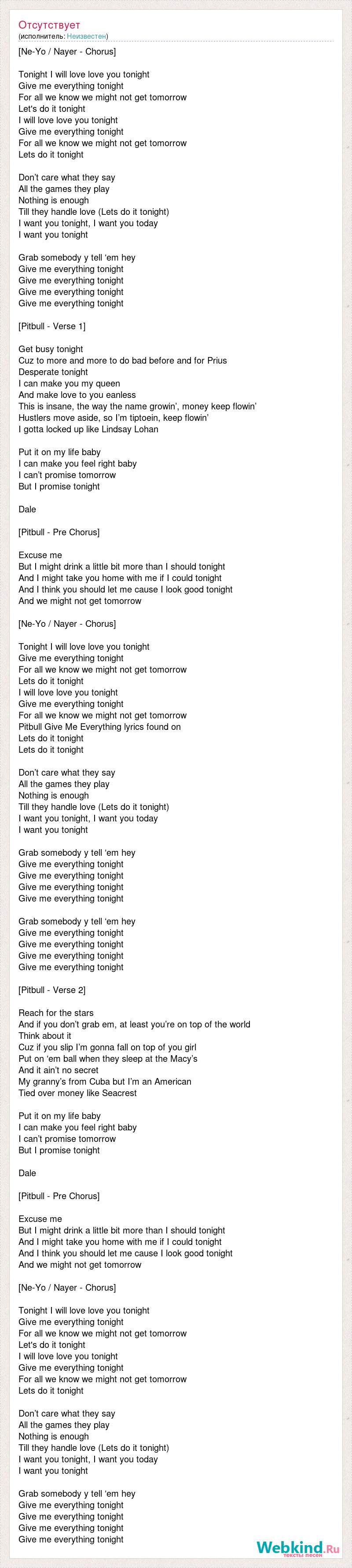 [Ne-Yo / Nayer - Chorus] Tonight I will love love you tonight Give me everything tonight For all we know we might not get tomorrow Let's do it tonight I will love love you tonight Give me everything tonight For all we know we might not get tomorrow Lets do it tonight Don’t care what they say All the games they play Nothing is enough Till they handle love (Lets do it tonight) I want you tonight, I want you today I want you tonight Grab somebody y tell ‘em hey Give me everything tonight Give me everything tonight Give me everything tonight Give me everything tonight [Pitbull - Verse 1] Get busy tonight Cuz to more and more to do bad before and for Prius Desperate tonight I can make you my queen And make love to you eanless This is insane, the way the name growin’, money keep flowin’ Hustlers move aside, so I’m tiptoein, keep flowin’ I gotta locked up like Lindsay Lohan Put it on my life baby I can make you feel right baby I can’t promise tomorrow But I promise tonight Dale [Pitbull - Pre Chorus] Excuse me But I might drink a little bit more than I should tonight And I might take you home with me if I could tonight And I think you should let me cause I look good tonight And we might not get tomorrow [Ne-Yo / Nayer - Chorus] Tonight I will love love you tonight Give me everything tonight For all we know we might not get tomorrow Lets do it tonight I will love love you tonight Give me everything tonight For all we know we might not get tomorrow Pitbull Give Me Everything lyrics found on Lets do it tonight Lets do it tonight Don’t care what they say All the games they play Nothing is enough Till they handle love (Lets do it tonight) I want you tonight, I want you today I want you tonight Grab somebody y tell ‘em hey Give me everything tonight Give me everything tonight Give me everything tonight Give me everything tonight Grab somebody y tell ‘em hey Give me everything tonight Give me everything tonight Give me everything tonight Give me everything tonight [Pitbull - Verse 2] Reach for the stars And if you don’t grab em, at least you’re on top of the world Think about it Cuz if you slip I’m gonna fall on top of you girl Put on ‘em ball when they sleep at the Macy’s And it ain’t no secret My granny’s from Cuba but I’m an American Tied over money like Seacrest Put it on my life baby I can make you feel right baby I can’t promise tomorrow But I promise tonight Dale [Pitbull - Pre Chorus] Excuse me But I might drink a little bit more than I should tonight And I might take you home with me if I could tonight And I think you should let me cause I look good tonight And we might not get tomorrow [Ne-Yo / Nayer - Chorus] Tonight I will love love you tonight Give me everything tonight For all we know we might not get tomorrow Let's do it tonight I will love love you tonight Give me everything tonight For all we know we might not get tomorrow Lets do it tonight Don’t care what they say All the games they play Nothing is enough Till they handle love (Lets do it tonight) I want you tonight, I want you today I want you tonight Grab somebody y tell ‘em hey Give me everything tonight Give me everything tonight Give me everything tonight Give me everything tonight