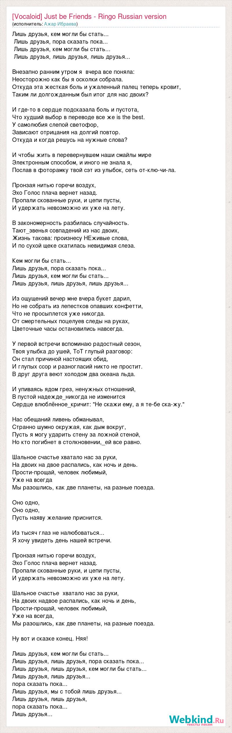 Лишь друзья, кем могли бы стать... Лишь друзья, пора сказать пока... Лишь друзья, кем могли бы стать... Лишь друзья, лишь друзья, лишь друзья... Внезапно ранним утром я вчера все поняла: Неосторожно как бы я осколки собрала. Откуда эта жесткая боль и ужаленный палец теперь кровит, Таким ли долгожданным был итог для нас двоих? И где-то в сердце подсказала боль и пустота, Что худший выбор в переводе все же is the best. У самолюбия слепой светофор, Зависают отрицания на долгий повтор. Откуда и когда решусь на нужные слова? И чтобы жить в перевернувшем наши смайлы мире Электронным способом, и иного не знала я, Послав в фоторамку твой сэт из улыбок, сеть от-клю-чи-ла. Пронзая нитью горечи воздух, Эхо Голос плача вернет назад. Пропали скованные руки, и цепи пусты, И удержать невозможно их уже на лету. В закономерность разбилась случайность. Тают_звенья совпадений из нас двоих, Жизнь такова: произнесу НЕживые слова, И по сухой щеке скатилась невидимая слеза. Кем могли бы стать... Лишь друзья, пора сказать пока... Лишь друзья, кем могли бы стать... Лишь друзья, лишь друзья, лишь друзья... Из ощущений вечер мне вчера букет дарил, Но не собрать из лепестков опавших конфетти, Что не просыплется уже никогда. От смертельных поцелуев следы на руках, Цветочные часы остановились навсегда. У первой встречи вспоминаю радостный сезон, Твоя улыбка до ушей, ТоТ глупый разговор: Он стал причиной настоящих обид, И глупых ссор и разногласий никто не простит. В друг друга веют холодом два океана льда. И упиваясь ядом грез, ненужных отношений, В пустой надежде_никогда не изменится Сердце влюблённое_кричит: "Не скажи ему, а я те-бе ска-жу." Нас обещаний ливень обманывал, Странно шумно окружая, как дым вокруг, Пусть я могу ударить стену за ложной стеной, Но кто погибнет в столкновении,_ей все равно. Шальное счастье хватало нас за руки, На двоих на двое распались, как ночь и день. Прости-прощай, человек любимый, Уже на всегда Мы разошлись, как две планеты, на разные поезда. Оно одно, Оно одно, Пусть наяву желание приснится. Из тысяч глаз не налюбоваться... Я хочу увидеть день нашей встречи. Пронзая нитью горечи воздух, Эхо Голос плача вернет назад. Пропали скованные руки, и цепи пусты, И удержать невозможно их уже на лету. Шальное счастье хватало нас за руки, На двоих надвое распались, как ночь и день, Прости-прощай, человек любимый, Уже на всегда, Мы разошлись, как две планеты, на разные поезда. Ну вот и сказке конец. Няя! Лишь друзья, кем могли бы стать... Лишь друзья, лишь друзья, пора сказать пока... Лишь друзья, лишь друзья, кем могли бы стать... Лишь друзья, лишь друзья... пора сказать пока... Лишь друзья, мы с тобой лишь друзья... Лишь друзья, лишь друзья, пора сказать пока... Лишь друзья...