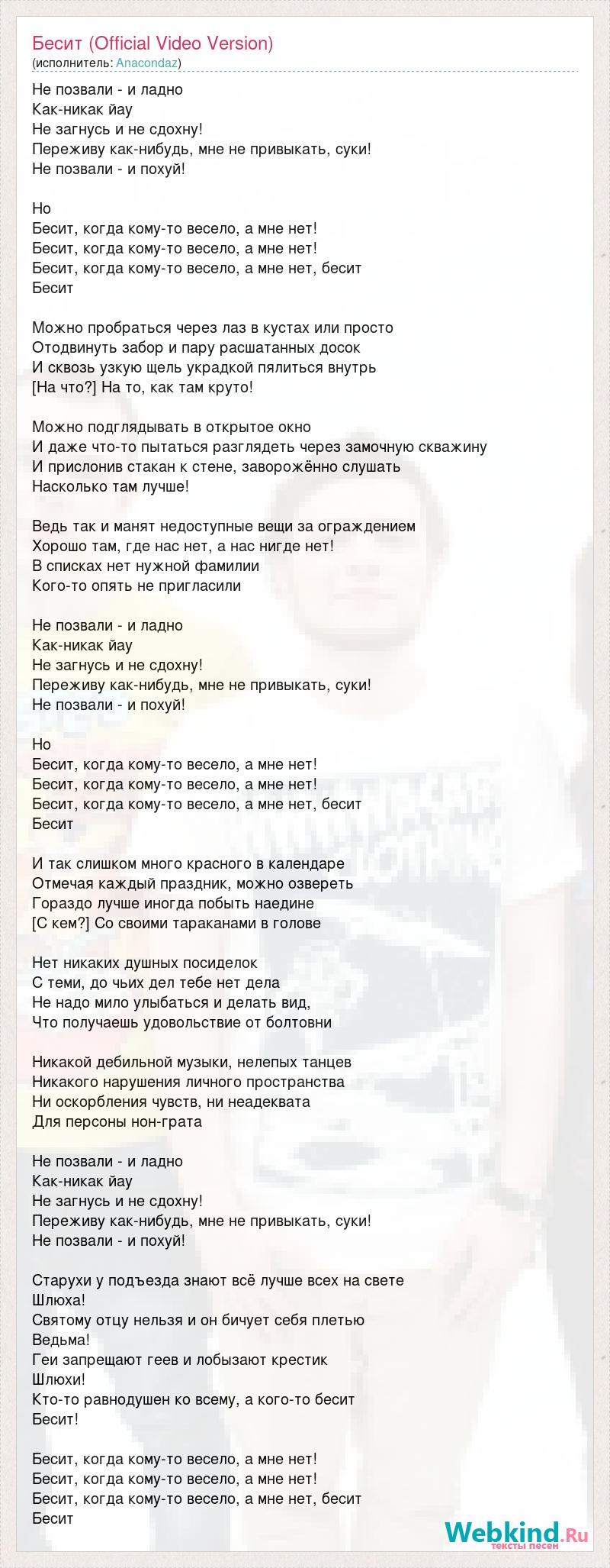 Не позвали - и ладно Как-никак йау Не загнусь и не сдохну! Переживу как-нибудь, мне не привыкать, суки! Не позвали - и похуй! Но Бесит, когда кому-то весело, а мне нет! Бесит, когда кому-то весело, а мне нет! Бесит, когда кому-то весело, а мне нет, бесит Бесит Можно пробраться через лаз в кустах или просто Отодвинуть забор и пару расшатанных досок И сквозь узкую щель украдкой пялиться внутрь [На что?] На то, как там круто! Можно подглядывать в открытое окно И даже что-то пытаться разглядеть через замочную скважину И прислонив стакан к стене, заворожённо слушать Насколько там лучше! Ведь так и манят недоступные вещи за ограждением Хорошо там, где нас нет, а нас нигде нет! В списках нет нужной фамилии Кого-то опять не пригласили Не позвали - и ладно Как-никак йау Не загнусь и не сдохну! Переживу как-нибудь, мне не привыкать, суки! Не позвали - и похуй! Но Бесит, когда кому-то весело, а мне нет! Бесит, когда кому-то весело, а мне нет! Бесит, когда кому-то весело, а мне нет, бесит Бесит И так слишком много красного в календаре Отмечая каждый праздник, можно озвереть Гораздо лучше иногда побыть наедине [С кем?] Со своими тараканами в голове Нет никаких душных посиделок С теми, до чьих дел тебе нет дела Не надо мило улыбаться и делать вид, Что получаешь удовольствие от болтовни Никакой дебильной музыки, нелепых танцев Никакого нарушения личного пространства Ни оскорбления чувств, ни неадеквата Для персоны нон-грата Не позвали - и ладно Как-никак йау Не загнусь и не сдохну! Переживу как-нибудь, мне не привыкать, суки! Не позвали - и похуй! Старухи у подъезда знают всё лучше всех на свете Шлюха! Святому отцу нельзя и он бичует себя плетью Ведьма! Геи запрещают геев и лобызают крестик Шлюхи! Кто-то равнодушен ко всему, а кого-то бесит Бесит! Бесит, когда кому-то весело, а мне нет! Бесит, когда кому-то весело, а мне нет! Бесит, когда кому-то весело, а мне нет, бесит Бесит