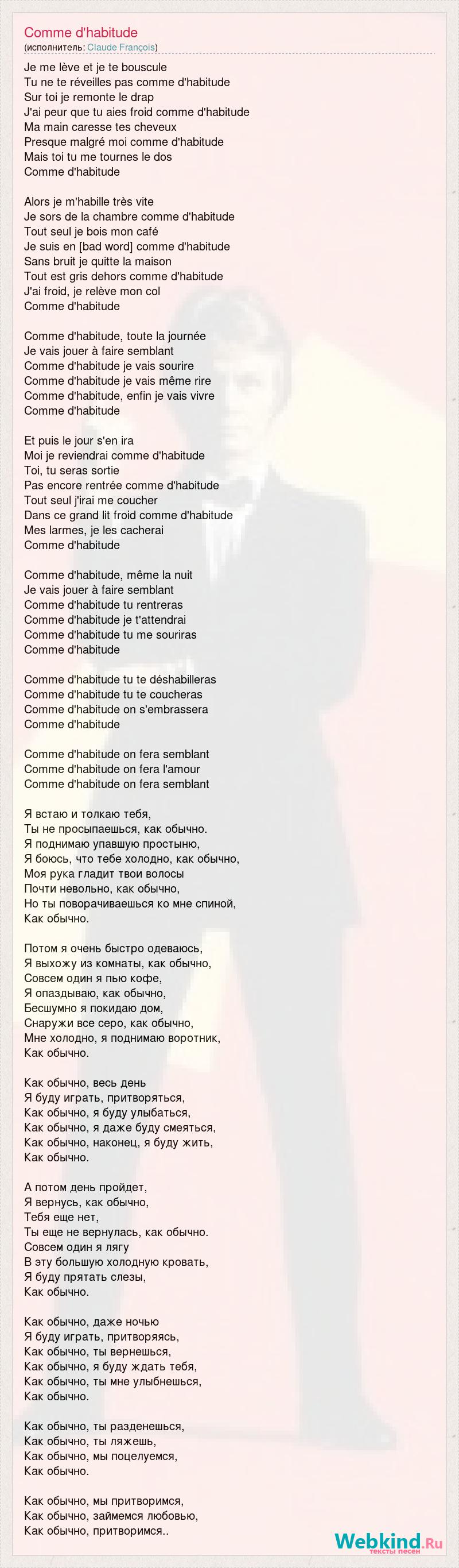 Je me lève et je te bouscule Tu ne te réveilles pas comme d'habitude Sur toi je remonte le drap J'ai peur que tu aies froid comme d'habitude Ma main caresse tes cheveux Presque malgré moi comme d'habitude Mais toi tu me tournes le dos Comme d'habitude Alors je m'habille très vite Je sors de la chambre comme d'habitude Tout seul je bois mon café Je suis en [bad word] comme d'habitude Sans bruit je quitte la maison Tout est gris dehors comme d'habitude J'ai froid, je relève mon col Comme d'habitude Comme d'habitude, toute la journée Je vais jouer à faire semblant Comme d'habitude je vais sourire Comme d'habitude je vais même rire Comme d'habitude, enfin je vais vivre Comme d'habitude Et puis le jour s'en ira Moi je reviendrai comme d'habitude Toi, tu seras sortie Pas encore rentrée comme d'habitude Tout seul j'irai me coucher Dans ce grand lit froid comme d'habitude Mes larmes, je les cacherai Comme d'habitude Comme d'habitude, même la nuit Je vais jouer à faire semblant Comme d'habitude tu rentreras Comme d'habitude je t'attendrai Comme d'habitude tu me souriras Comme d'habitude Comme d'habitude tu te déshabilleras Comme d'habitude tu te coucheras Comme d'habitude on s'embrassera Comme d'habitude Comme d'habitude on fera semblant Comme d'habitude on fera l'amour Comme d'habitude on fera semblant Я встаю и толкаю тебя, Ты не просыпаешься, как обычно. Я поднимаю упавшую простыню, Я боюсь, что тебе холодно, как обычно, Моя рука гладит твои волосы Почти невольно, как обычно, Но ты поворачиваешься ко мне спиной, Как обычно. Потом я очень быстро одеваюсь, Я выхожу из комнаты, как обычно, Совсем один я пью кофе, Я опаздываю, как обычно, Бесшумно я покидаю дом, Снаружи все серо, как обычно, Мне холодно, я поднимаю воротник, Как обычно. Как обычно, весь день Я буду играть, притворяться, Как обычно, я буду улыбаться, Как обычно, я даже буду смеяться, Как обычно, наконец, я буду жить, Как обычно. А потом день пройдет, Я вернусь, как обычно, Тебя еще нет, Ты еще не вернулась, как обычно. Совсем один я лягу В эту большую холодную кровать, Я буду прятать слезы, Как обычно. Как обычно, даже ночью Я буду играть, притворяясь, Как обычно, ты вернешься, Как обычно, я буду ждать тебя, Как обычно, ты мне улыбнешься, Как обычно. Как обычно, ты разденешься, Как обычно, ты ляжешь, Как обычно, мы поцелуемся, Как обычно. Как обычно, мы притворимся, Как обычно, займемся любовью, Как обычно, притворимся..