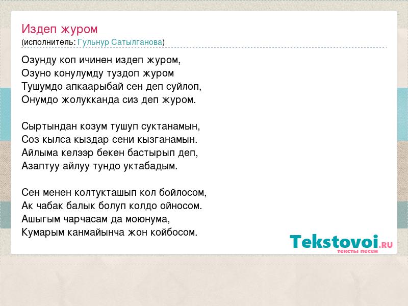 Озунду коп ичинен издеп журом, Озуно конулумду туздоп журом Тушумдо апкаарыбай сен деп суйлоп, Онумдо жолукканда сиз деп журом. Сыртындан козум тушуп суктанамын, Соз кылса кыздар сени кызганамын. Айлыма келээр бекен бастырып деп, Азаптуу айлуу тундо уктабадым. Сен менен колтукташып кол бойлосом, Ак чабак балык болуп колдо ойносом. Ашыгым чарчасам да моюнума, Кумарым канмайынча жон койбосом.