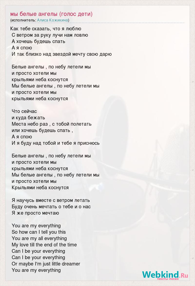 Как тебе сказать, что я люблю С ветром за руку лучи нам ловлю А хочешь будешь спать А я спою И так близко над звездой мечту свою дарю Белые ангелы , по небу летели мы и просто хотели мы крыльями неба коснутся Мы белые ангелы , по небу летели мы и просто хотели мы крыльями неба коснутся Что сейчас и куда бежать Места небо раз , с тобой полетать или хочешь будешь спать , А я спою И я буду над тобой и тебе я приснюсь Белые ангелы , по небу летели мы и просто хотели мы крыльями неба коснутся Мы белые ангелы , по небу летели мы и просто хотели мы Крыльями неба коснутся Я научусь вместе с ветром летать Буду очень мечтать о тебе и о нас Я же просто мечтаю You are my everything So how can I tell you this You are my all everything My love till the end of the time Can I be your everything Can I be your everything Or maybe I'm just little dreamer You are my everything