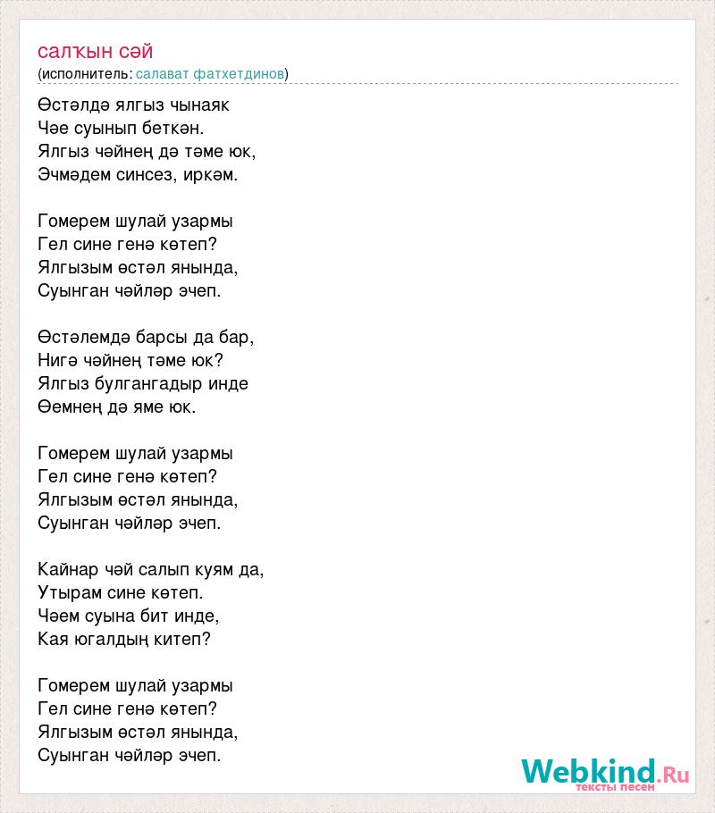 Өстәлдә ялгыз чынаяк Чәе суынып беткән. Ялгыз чәйнең дә тәме юк, Эчмәдем синсез, иркәм. Гомерем шулай узармы Гел сине генә көтеп? Ялгызым өстәл янында, Суынган чәйләр эчеп. Өстәлемдә барсы да бар, Нигә чәйнең тәме юк? Ялгыз булгангадыр инде Өемнең дә яме юк. Гомерем шулай узармы Гел сине генә көтеп? Ялгызым өстәл янында, Суынган чәйләр эчеп. Кайнар чәй салып куям да, Утырам сине көтеп. Чәем суына бит инде, Кая югалдың китеп? Гомерем шулай узармы Гел сине генә көтеп? Ялгызым өстәл янында, Суынган чәйләр эчеп.