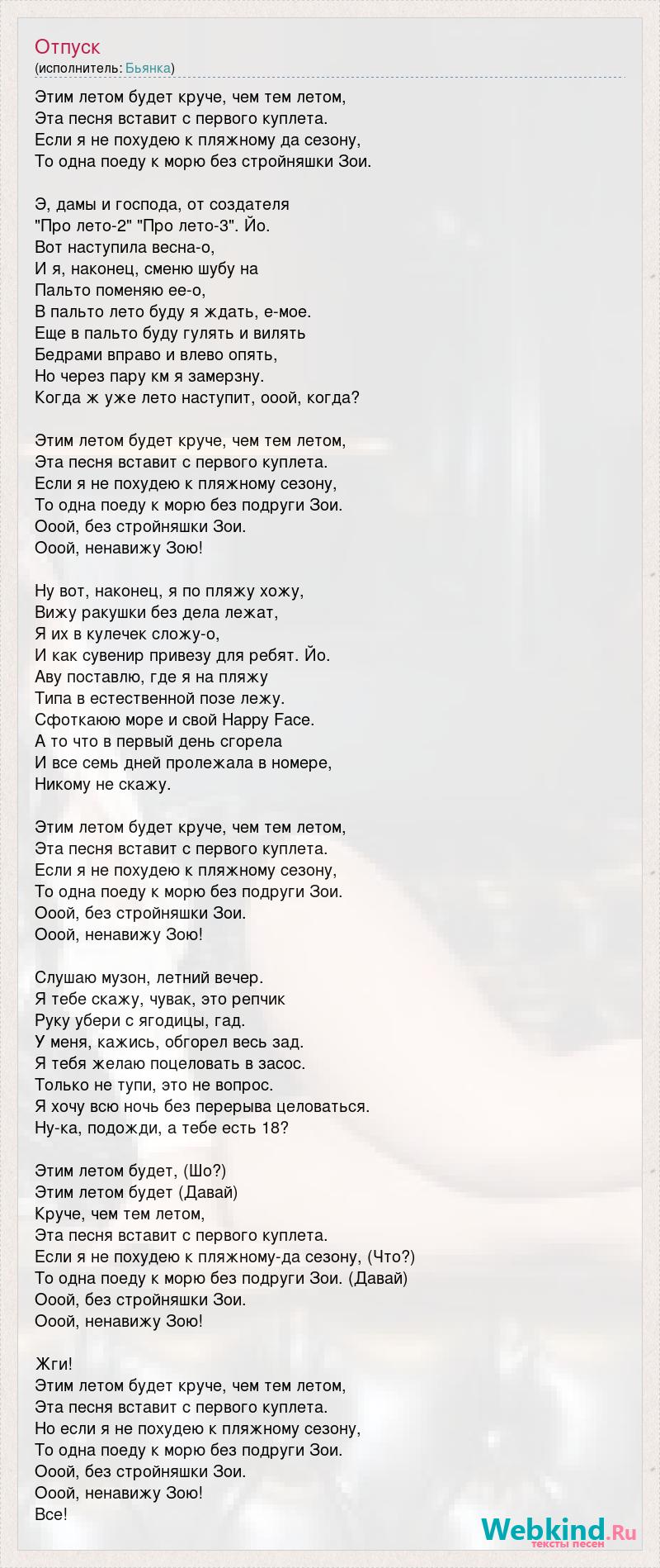 Этим летом будет круче, чем тем летом, Эта песня вставит с первого куплета. Если я не похудею к пляжному да сезону, То одна поеду к морю без стройняшки Зои. Э, дамы и господа, от создателя "Про лето-2" "Про лето-3". Йо. Вот наступила весна-о, И я, наконец, сменю шубу на Пальто поменяю ее-о, В пальто лето буду я ждать, е-мое. Еще в пальто буду гулять и вилять Бедрами вправо и влево опять, Но через пару км я замерзну. Когда ж уже лето наступит, ооой, когда? Этим летом будет круче, чем тем летом, Эта песня вставит с первого куплета. Если я не похудею к пляжному сезону, То одна поеду к морю без подруги Зои. Ооой, без стройняшки Зои. Ооой, ненавижу Зою! Ну вот, наконец, я по пляжу хожу, Вижу ракушки без дела лежат, Я их в кулечек сложу-о, И как сувенир привезу для ребят. Йо. Аву поставлю, где я на пляжу Типа в естественной позе лежу. Сфоткаюю море и свой Happy Face. А то что в первый день сгорела И все семь дней пролежала в номере, Никому не скажу. Этим летом будет круче, чем тем летом, Эта песня вставит с первого куплета. Если я не похудею к пляжному сезону, То одна поеду к морю без подруги Зои. Ооой, без стройняшки Зои. Ооой, ненавижу Зою! Слушаю музон, летний вечер. Я тебе скажу, чувак, это репчик Руку убери с ягодицы, гад. У меня, кажись, обгорел весь зад. Я тебя желаю поцеловать в засос. Только не тупи, это не вопрос. Я хочу всю ночь без перерыва целоваться. Ну-ка, подожди, а тебе есть 18? Этим летом будет, (Шо?) Этим летом будет (Давай) Круче, чем тем летом, Эта песня вставит с первого куплета. Если я не похудею к пляжному-да сезону, (Что?) То одна поеду к морю без подруги Зои. (Давай) Ооой, без стройняшки Зои. Ооой, ненавижу Зою! Жги! Этим летом будет круче, чем тем летом, Эта песня вставит с первого куплета. Но если я не похудею к пляжному сезону, То одна поеду к морю без подруги Зои. Ооой, без стройняшки Зои. Ооой, ненавижу Зою! Все!