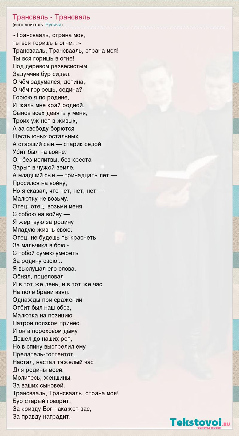 «Трансвааль, страна моя, ты вся горишь в огне…» Трансвааль, Трансвааль, страна моя! Ты вся горишь в огне! Под деревом развесистым Задумчив бур сидел. О чём задумался, детина, О чём горюешь, седина? Горюю я по родине, И жаль мне край родной. Сынов всех девять у меня, Троих уж нет в живых, А за свободу борются Шесть юных остальных. А старший сын — старик седой Убит был на войне: Он без молитвы, без креста Зарыт в чужой земле. А младший сын — тринадцать лет — Просился на войну, Но я сказал, что нет, нет, нет — Малютку не возьму. Отец, отец, возьми меня С собою на войну — Я жертвую за родину Младую жизнь свою. Отец, не будешь ты краснеть За мальчика в бою - С тобой сумею умереть За родину свою!.. Я выслушал его слова, Обнял, поцеловал И в тот же день, и в тот же час На поле брани взял. Однажды при сражении Отбит был наш обоз, Малютка на позицию Патрон ползком принёс. И он в пороховом дыму Дошел до наших рот, Но в спину выстрелил ему Предатель-готтентот. Настал, настал тяжёлый час Для родины моей, Молитесь, женщины, За ваших сыновей. Трансвааль, Трансвааль, страна моя! Бур старый говорит: За кривду Бог накажет вас, За правду наградит.