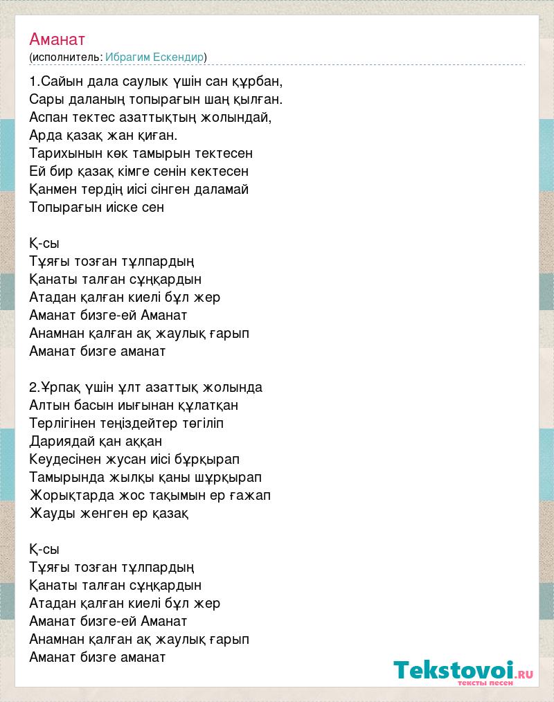 1.Сайын дала саулык үшін сан құрбан, Сары даланың топырағын шаң қылған. Аспан тектес азаттықтың жолындай, Арда қазақ жан қиған. Тарихынын көк тамырын тектесен Ей бир қазақ кімге сенін кектесен Қанмен тердің иісі сінген даламай Топырағын иіске сен Қ-сы Тұяғы тозған тұлпардың Қанаты талған сұңқардын Атадан қалған киелі бұл жер Аманат бизге-ей Аманат Анамнан қалған ақ жаулық ғарып Аманат бизге аманат 2.Ұрпақ үшін ұлт азаттық жолында Алтын басын иығынан құлатқан Терлігінен теңіздейтер төгіліп Дариядай қан аққан Кеудесінен жусан иісі бұрқырап Тамырында жылқы қаны шұрқырап Жорықтарда жос тақымын ер ғажап Жауды женген ер қазақ Қ-сы Тұяғы тозған тұлпардың Қанаты талған сұңқардын Атадан қалған киелі бұл жер Аманат бизге-ей Аманат Анамнан қалған ақ жаулық ғарып Аманат бизге аманат