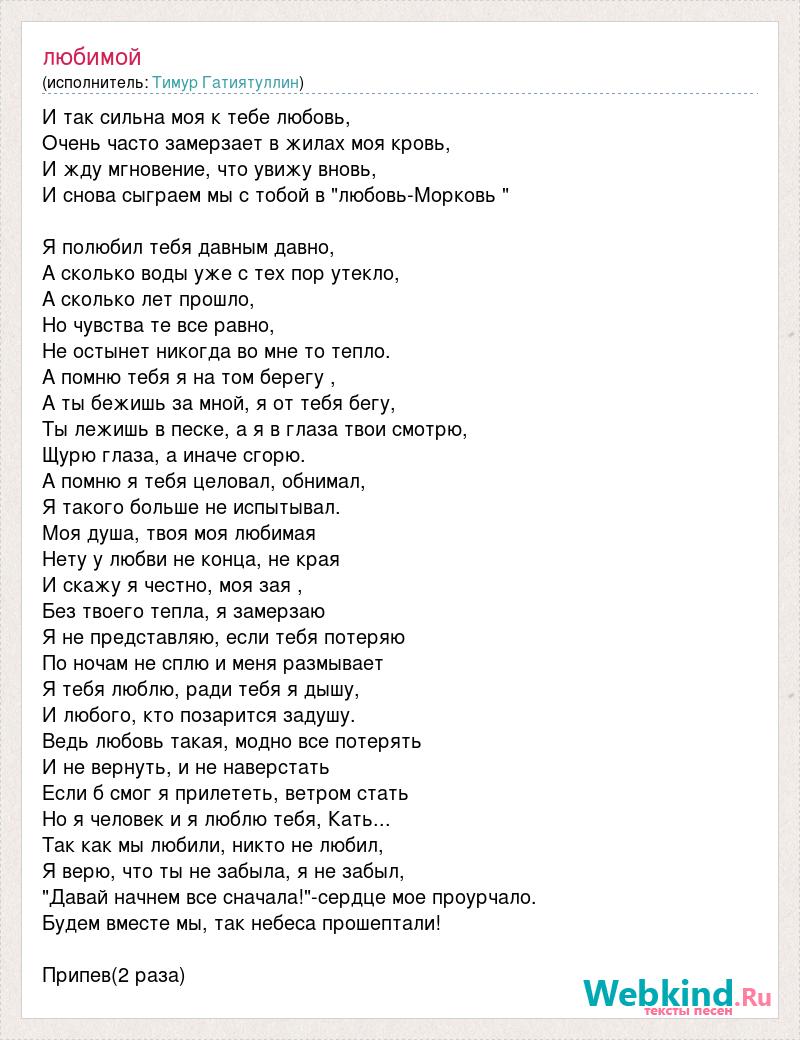 И так сильна моя к тебе любовь, Очень часто замерзает в жилах моя кровь, И жду мгновение, что увижу вновь, И снова сыграем мы с тобой в "любовь-Морковь " Я полюбил тебя давным давно, А сколько воды уже с тех пор утекло, А сколько лет прошло, Но чувства те все равно, Не остынет никогда во мне то тепло. А помню тебя я на том берегу , А ты бежишь за мной, я от тебя бегу, Ты лежишь в песке, а я в глаза твои смотрю, Щурю глаза, а иначе сгорю. А помню я тебя целовал, обнимал, Я такого больше не испытывал. Моя душа, твоя моя любимая Нету у любви не конца, не края И скажу я честно, моя зая , Без твоего тепла, я замерзаю Я не представляю, если тебя потеряю По ночам не сплю и меня размывает Я тебя люблю, ради тебя я дышу, И любого, кто позарится задушу. Ведь любовь такая, модно все потерять И не вернуть, и не наверстать Если б смог я прилететь, ветром стать Но я человек и я люблю тебя, Кать... Так как мы любили, никто не любил, Я верю, что ты не забыла, я не забыл, "Давай начнем все сначала!"-сердце мое проурчало. Будем вместе мы, так небеса прошептали! Припев(2 раза)