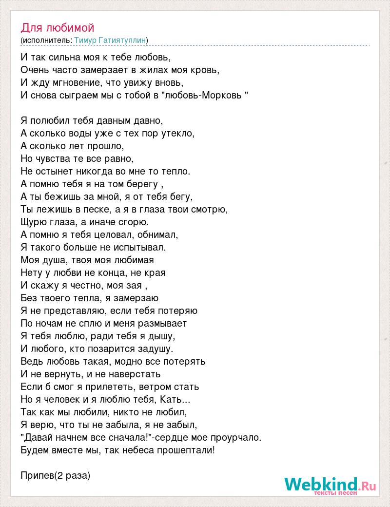 И так сильна моя к тебе любовь, Очень часто замерзает в жилах моя кровь, И жду мгновение, что увижу вновь, И снова сыграем мы с тобой в "любовь-Морковь " Я полюбил тебя давным давно, А сколько воды уже с тех пор утекло, А сколько лет прошло, Но чувства те все равно, Не остынет никогда во мне то тепло. А помню тебя я на том берегу , А ты бежишь за мной, я от тебя бегу, Ты лежишь в песке, а я в глаза твои смотрю, Щурю глаза, а иначе сгорю. А помню я тебя целовал, обнимал, Я такого больше не испытывал. Моя душа, твоя моя любимая Нету у любви не конца, не края И скажу я честно, моя зая , Без твоего тепла, я замерзаю Я не представляю, если тебя потеряю По ночам не сплю и меня размывает Я тебя люблю, ради тебя я дышу, И любого, кто позарится задушу. Ведь любовь такая, модно все потерять И не вернуть, и не наверстать Если б смог я прилететь, ветром стать Но я человек и я люблю тебя, Кать... Так как мы любили, никто не любил, Я верю, что ты не забыла, я не забыл, "Давай начнем все сначала!"-сердце мое проурчало. Будем вместе мы, так небеса прошептали! Припев(2 раза)