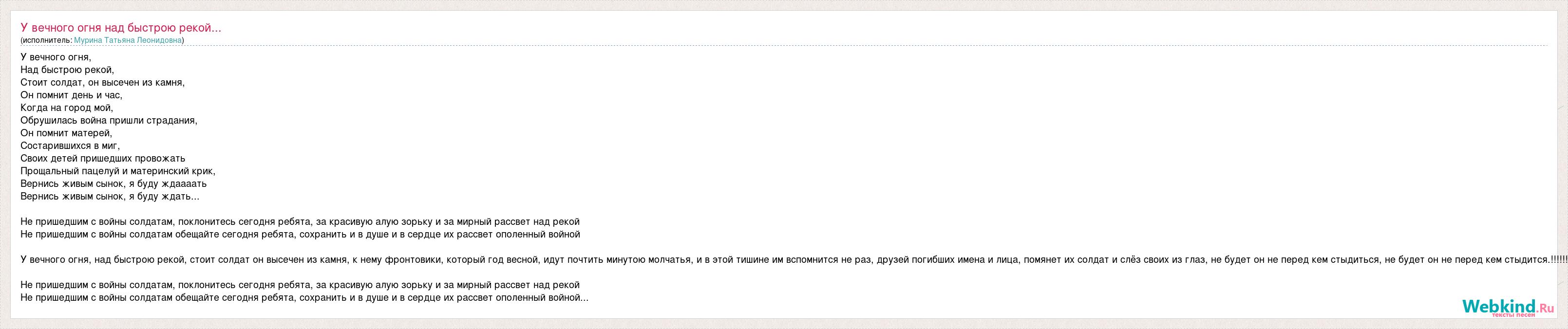 У вечного огня, Над быстрою рекой, Стоит солдат, он высечен из камня, Он помнит день и час, Когда на город мой, Обрушилась война пришли страдания, Он помнит матерей, Состарившихся в миг, Своих детей пришедших провожать Прощальный пацелуй и материнский крик, Вернись живым сынок, я буду ждаааать Вернись живым сынок, я буду ждать... Не пришедшим с войны солдатам, поклонитесь сегодня ребята, за красивую алую зорьку и за мирный рассвет над рекой Не пришедшим с войны солдатам обещайте сегодня ребята, сохранить и в душе и в сердце их рассвет ополенный войной У вечного огня, над быстрою рекой, стоит солдат он высечен из камня, к нему фронтовики, который год весной, идут почтить минутою молчатья, и в этой тишине им вспомнится не раз, друзей погибших имена и лица, помянет их солдат и слёз своих из глаз, не будет он не перед кем стыдиться, не будет он не перед кем стыдится.!!!!!! Не пришедшим с войны солдатам, поклонитесь сегодня ребята, за красивую алую зорьку и за мирный рассвет над рекой Не пришедшим с войны солдатам обещайте сегодня ребята, сохранить и в душе и в сердце их рассвет ополенный войной...
