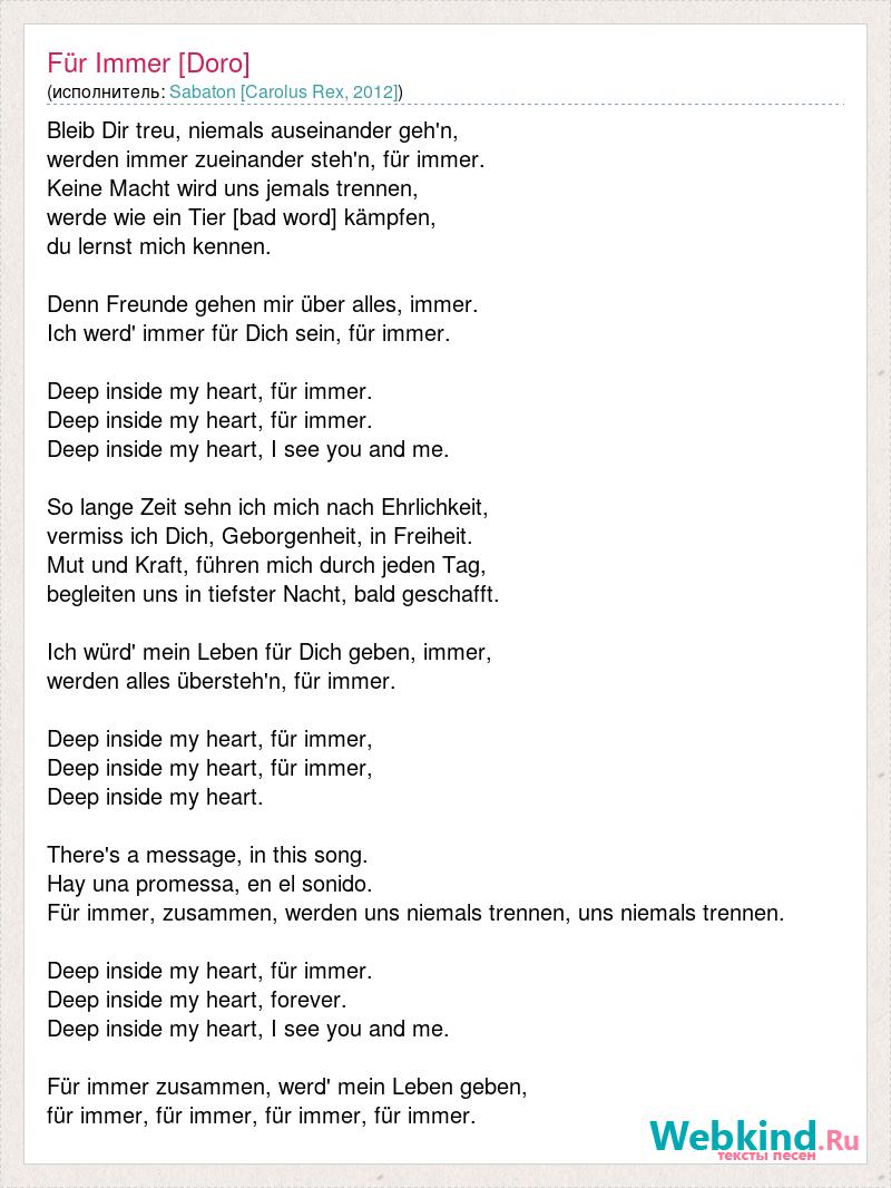 Bleib Dir treu, niemals auseinander geh'n, werden immer zueinander steh'n, für immer. Keine Macht wird uns jemals trennen, werde wie ein Tier [bad word] kämpfen, du lernst mich kennen. Denn Freunde gehen mir über alles, immer. Ich werd' immer für Dich sein, für immer. Deep inside my heart, für immer. Deep inside my heart, für immer. Deep inside my heart, I see you and me. So lange Zeit sehn ich mich nach Ehrlichkeit, vermiss ich Dich, Geborgenheit, in Freiheit. Mut und Kraft, führen mich durch jeden Tag, begleiten uns in tiefster Nacht, bald geschafft. Ich würd' mein Leben für Dich geben, immer, werden alles übersteh'n, für immer. Deep inside my heart, für immer, Deep inside my heart, für immer, Deep inside my heart. There's a message, in this song. Hay una promessa, en el sonido. Für immer, zusammen, werden uns niemals trennen, uns niemals trennen. Deep inside my heart, für immer. Deep inside my heart, forever. Deep inside my heart, I see you and me. Für immer zusammen, werd' mein Leben geben, für immer, für immer, für immer, für immer.