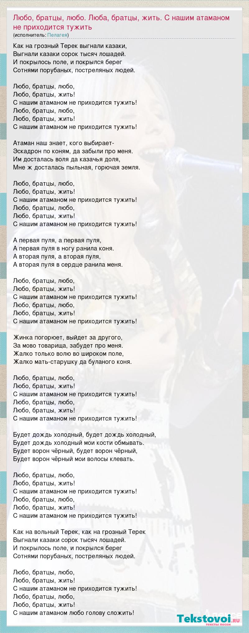Как на грозный Терек выгнали казаки, Выгнали казаки сорок тысяч лошадей. И покрылось поле, и покрылся берег Сотнями порубаных, постреляных людей. Любо, братцы, любо, Любо, братцы, жить! С нашим атаманом не приходится тужить! Любо, братцы, любо, Любо, братцы, жить! С нашим атаманом не приходится тужить! Атаман наш знает, кого выбирает- Эскадрон по коням, да забыли про меня. Им досталась воля да казачья доля, Мне ж досталась пыльная, горючая земля. Любо, братцы, любо, Любо, братцы, жить! С нашим атаманом не приходится тужить! Любо, братцы, любо, Любо, братцы, жить! С нашим атаманом не приходится тужить! А первая пуля, а первая пуля, А первая пуля в ногу ранила коня. А вторая пуля, а вторая пуля, А вторая пуля в сердце ранила меня. Любо, братцы, любо, Любо, братцы, жить! С нашим атаманом не приходится тужить! Любо, братцы, любо, Любо, братцы, жить! С нашим атаманом не приходится тужить! Жинка погорюет, выйдет за другого, За мово товарища, забудет про меня. Жалко только волю во широком поле, Жалко мать-старушку да буланого коня. Любо, братцы, любо, Любо, братцы, жить! С нашим атаманом не приходится тужить! Любо, братцы, любо, Любо, братцы, жить! С нашим атаманом не приходится тужить! Будет дождь холодный, будет дождь холодный, Будет дождь холодный мои кости обмывать. Будет ворон чёрный, будет ворон чёрный, Будет ворон чёрный мои волосы клевать. Любо, братцы, любо, Любо, братцы, жить! С нашим атаманом не приходится тужить! Любо, братцы, любо, Любо, братцы, жить! С нашим атаманом не приходится тужить! Как на вольный Терек, как на грозный Терек Выгнали казаки сорок тысяч лошадей. И покрылось поле, и покрылся берег Сотнями порубаных, постреляных людей. Любо, братцы, любо, Любо, братцы, жить! С нашим атаманом не приходится тужить! Любо, братцы, любо, Любо, братцы, жить! С нашим атаманом любо голову сложить!