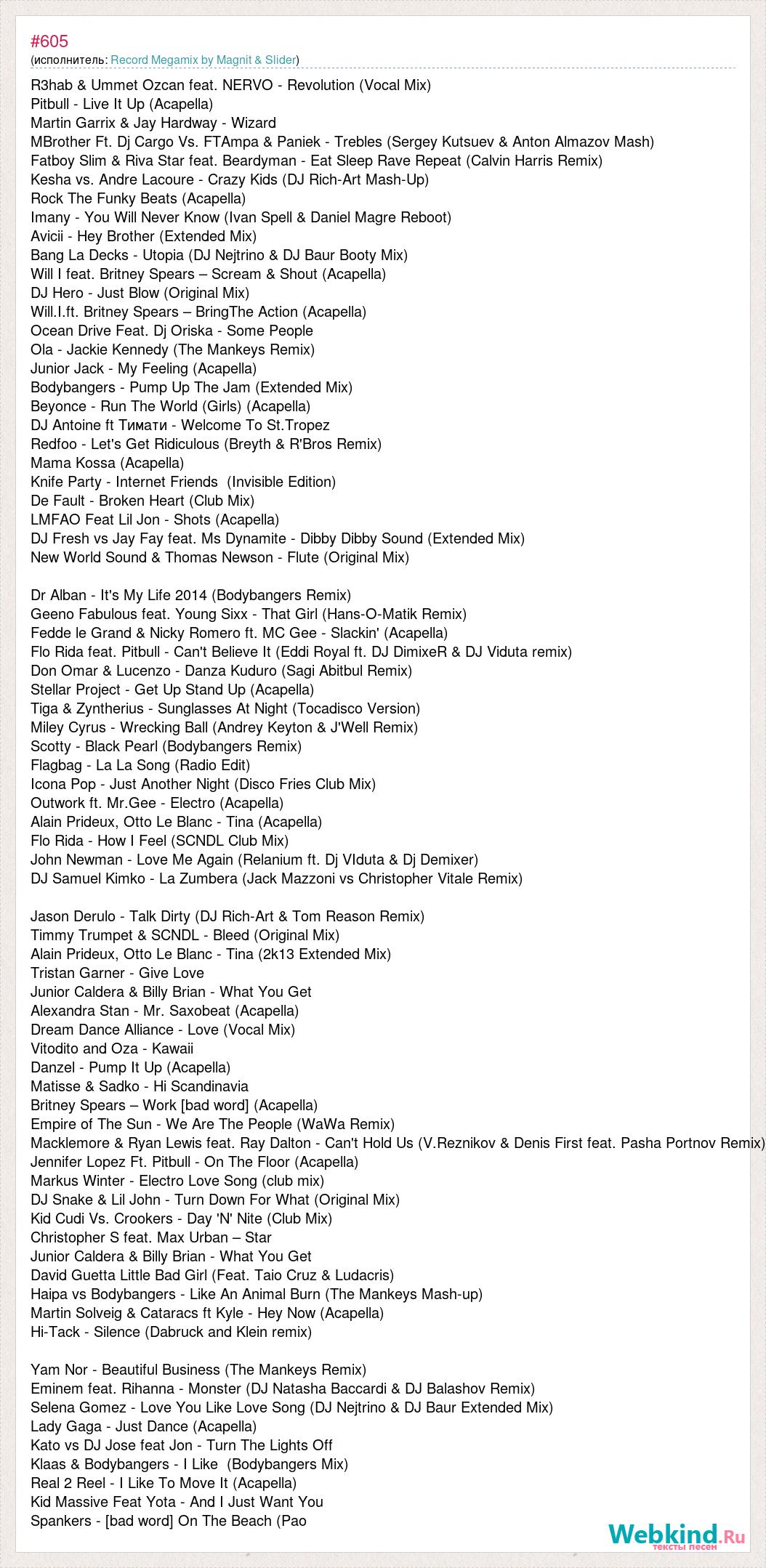 R3hab & Ummet Ozcan feat. NERVO - Revolution (Vocal Mix) Pitbull - Live It Up (Acapella) Martin Garrix & Jay Hardway - Wizard MBrother Ft. Dj Cargo Vs. FTAmpa & Paniek - Trebles (Sergey Kutsuev & Anton Almazov Mash) Fatboy Slim & Riva Star feat. Beardyman - Eat Sleep Rave Repeat (Calvin Harris Remix) Kesha vs. Andre Lacoure - Crazy Kids (DJ Rich-Art Mash-Up) Rock The Funky Beats (Acapella) Imany - You Will Never Know (Ivan Spell & Daniel Magre Reboot) Avicii - Hey Brother (Extended Mix) Bang La Decks - Utopia (DJ Nejtrino & DJ Baur Booty Mix) Will I feat. Britney Spears – Scream & Shout (Acapella) DJ Hero - Just Blow (Original Mix) Will.I.ft. Britney Spears – BringThe Action (Acapella) Ocean Drive Feat. Dj Oriska - Some People Ola - Jackie Kennedy (The Mankeys Remix) Junior Jack - My Feeling (Acapella) Bodybangers - Pump Up The Jam (Extended Mix) Beyonce - Run The World (Girls) (Acapella) DJ Antoine ft Тимати - Welcome To St.Tropez Redfoo - Let's Get Ridiculous (Breyth & R'Bros Remix) Mama Kossa (Acapella) Knife Party - Internet Friends (Invisible Edition) De Fault - Broken Heart (Club Mix) LMFAO Feat Lil Jon - Shots (Acapella) DJ Fresh vs Jay Fay feat. Ms Dynamite - Dibby Dibby Sound (Extended Mix) New World Sound & Thomas Newson - Flute (Original Mix) Dr Alban - It's My Life 2014 (Bodybangers Remix) Geeno Fabulous feat. Young Sixx - That Girl (Hans-O-Matik Remix) Fedde le Grand & Nicky Romero ft. MC Gee - Slackin' (Acapella) Flo Rida feat. Pitbull - Can't Believe It (Eddi Royal ft. DJ DimixeR & DJ Viduta remix) Don Omar & Lucenzo - Danza Kuduro (Sagi Abitbul Remix) Stellar Project - Get Up Stand Up (Acapella) Tiga & Zyntherius - Sunglasses At Night (Tocadisco Version) Miley Cyrus - Wrecking Ball (Andrey Keyton & J'Well Remix) Scotty - Black Pearl (Bodybangers Remix) Flagbag - La La Song (Radio Edit) Icona Pop - Just Another Night (Disco Fries Club Mix) Outwork ft. Mr.Gee - Electro (Acapella) Alain Prideux, Otto Le Blanc - Tina (Acapella) Flo Rida - How I Feel (SCNDL Club Mix) John Newman - Love Me Again (Relanium ft. Dj VIduta & Dj Demixer) DJ Samuel Kimko - La Zumbera (Jack Mazzoni vs Christopher Vitale Remix) Jason Derulo - Talk Dirty (DJ Rich-Art & Tom Reason Remix) Timmy Trumpet & SCNDL - Bleed (Original Mix) Alain Prideux, Otto Le Blanc - Tina (2k13 Extended Mix) Tristan Garner - Give Love Junior Caldera & Billy Brian - What You Get Alexandra Stan - Mr. Saxobeat (Acapella) Dream Dance Alliance - Love (Vocal Mix) Vitodito and Oza - Kawaii Danzel - Pump It Up (Acapella) Matisse & Sadko - Hi Scandinavia Britney Spears – Work [bad word] (Acapella) Empire of The Sun - We Are The People (WaWa Remix) Macklemore & Ryan Lewis feat. Ray Dalton - Can't Hold Us (V.Reznikov & Denis First feat. Pasha Portnov Remix) Jennifer Lopez Ft. Pitbull - On The Floor (Acapella) Markus Winter - Electro Love Song (club mix) DJ Snake & Lil John - Turn Down For What (Original Mix) Kid Cudi Vs. Crookers - Day 'N' Nite (Club Mix) Christopher S feat. Max Urban – Star Junior Caldera & Billy Brian - What You Get David Guetta Little Bad Girl (Feat. Taio Cruz & Ludacris) Haipa vs Bodybangers - Like An Animal Burn (The Mankeys Mash-up) Martin Solveig & Cataracs ft Kyle - Hey Now (Acapella) Hi-Tack - Silence (Dabruck and Klein remix) Yam Nor - Beautiful Business (The Mankeys Remix) Eminem feat. Rihanna - Monster (DJ Natasha Baccardi & DJ Balashov Remix) Selena Gomez - Love You Like Love Song (DJ Nejtrino & DJ Baur Extended Mix) Lady Gaga - Just Dance (Acapella) Kato vs DJ Jose feat Jon - Turn The Lights Off Klaas & Bodybangers - I Like (Bodybangers Mix) Real 2 Reel - I Like To Move It (Acapella) Kid Massive Feat Yota - And I Just Want You Spankers - [bad word] On The Beach (Pao