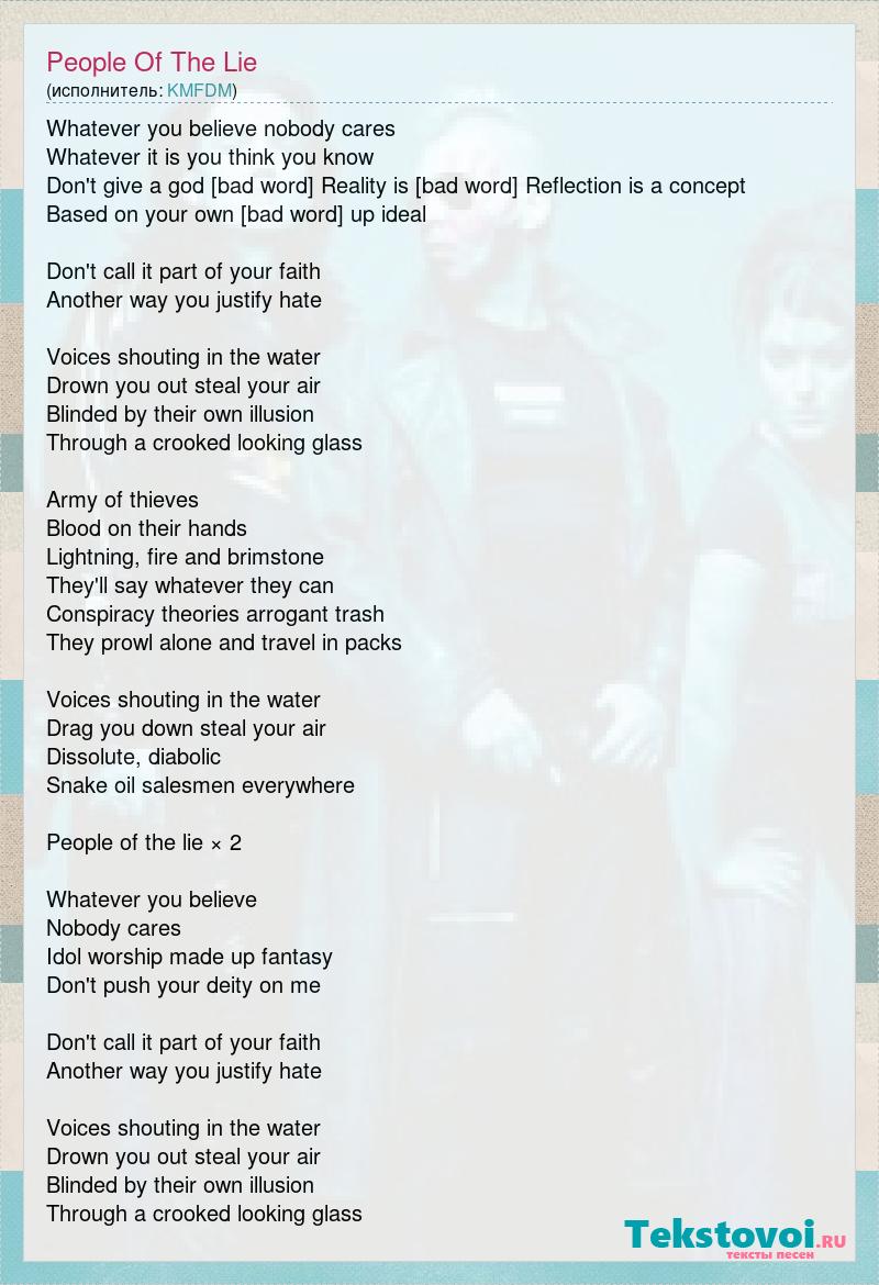 Whatever you believe nobody cares Whatever it is you think you know Don't give a god [bad word] Reality is [bad word] Reflection is a concept Based on your own [bad word] up ideal Don't call it part of your faith Another way you justify hate Voices shouting in the water Drown you out steal your air Blinded by their own illusion Through a crooked looking glass Army of thieves Blood on their hands Lightning, fire and brimstone They'll say whatever they can Conspiracy theories arrogant trash They prowl alone and travel in packs Voices shouting in the water Drag you down steal your air Dissolute, diabolic Snake oil salesmen everywhere People of the lie × 2 Whatever you believe Nobody cares Idol worship made up fantasy Don't push your deity on me Don't call it part of your faith Another way you justify hate Voices shouting in the water Drown you out steal your air Blinded by their own illusion Through a crooked looking glass