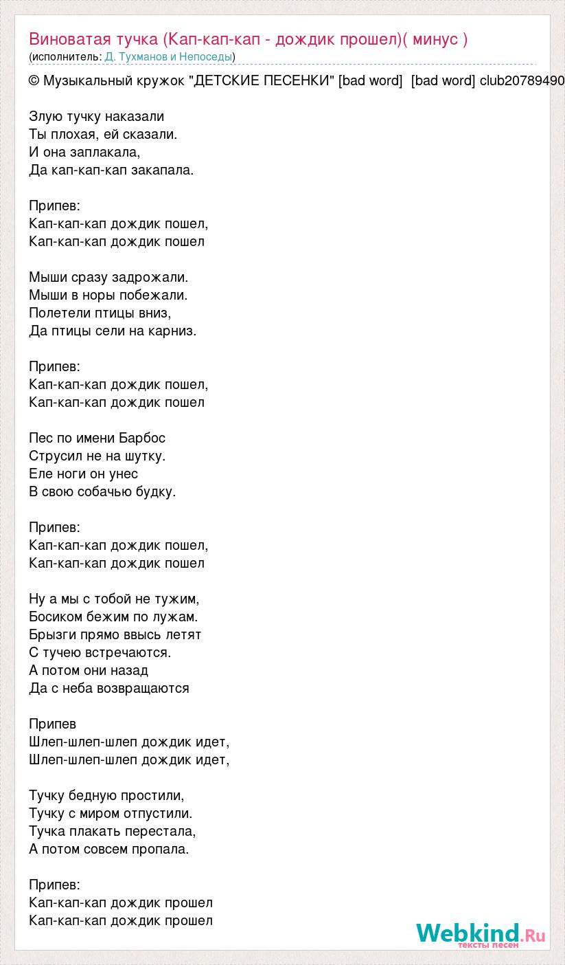 © Музыкальный кружок "ДЕТСКИЕ ПЕСЕНКИ" [bad word] [bad word] club20789490 Злую тучку наказали Ты плохая, ей сказали. И она заплакала, Да кап-кап-кап закапала. Припев: Кап-кап-кап дождик пошел, Кап-кап-кап дождик пошел Мыши сразу задрожали. Мыши в норы побежали. Полетели птицы вниз, Да птицы сели на карниз. Припев: Кап-кап-кап дождик пошел, Кап-кап-кап дождик пошел Пес по имени Барбос Струсил не на шутку. Еле ноги он унес В свою собачью будку. Припев: Кап-кап-кап дождик пошел, Кап-кап-кап дождик пошел Ну а мы с тобой не тужим, Босиком бежим по лужам. Брызги прямо ввысь летят С тучею встречаются. А потом они назад Да с неба возвращаются Припев Шлеп-шлеп-шлеп дождик идет, Шлеп-шлеп-шлеп дождик идет, Тучку бедную простили, Тучку с миром отпустили. Тучка плакать перестала, А потом совсем пропала. Припев: Кап-кап-кап дождик прошел Кап-кап-кап дождик прошел
