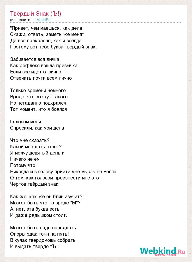 "Привет, чем маешься, как дела Скажи, ответь, заметь же меня" Да всё прекрасно, как и всегда Поэтому вот тебе буква твёрдый знак. Забивается вся личка Как рефлекс вошла привычка Если всё идет отлично Отвечать почти всем лично Только времени немного Вроде, что же тут такого Но негаданно подкрался Тот момент, что я боялся Голосом меня Спросили, как мои дела Что мне сказать? Какой мне дать ответ? Я молчу девятый день и Ничего не ем Потому что Никогда и в голову прийти мне мысль не могла О том, как голосом произнести мне этот Чертов твёрдый знак. Как же, как же он блин звучит?! Может быть что-то вроде "Ы"? А, нет, эта буква есть И даже рядышком стоит. Может быть надо наподдать Опоры эдак тонн на пять! В кулак твердомощь собрать И выдать твердо "Ъ!"