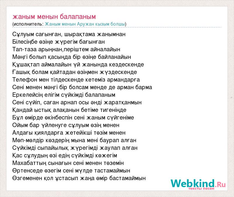 Сұлуым сағынған, шырақтама жанымнан Білесіңбе өзіңе жүрегім бағынған Тап-таза арыңнан,періштем айналайын Мәңгі болып қасыңда бір өзіңе байланайын Құшақтап аймалайын үй жанында кездескенде Ғашық болам қайтадан өзіңмен жүздескенде Телефон мен тілдескенде кетеміз армандарға Сені менен мәңгі бір болсам менде де арман барма Еркелейсің елігім сүйкімді балапаным Сені сүйіп, саған арнап осы әнді жаратқанмын Қандай ыстық алақанын бетіме тигеніңде Бұл өмірде өкінбеспін сені жаным сүйгеніме Ойым бар үйленуге сұлуым өзің менен Алдағы қиялдарға жетейікші төзім менен Мөп-мөлдір көздерің мына мені баурап алған Сүйкімді сыпайылық жүрегімді жаулап алған Қас сұлудың өзі едің сүйкімді көжегім Махабаттың сынағын сені менен төземін Өртенседе өзегім сені мүлде тастамаймын Өзгеменен қол ұстасып жаңа өмір бастамаймын