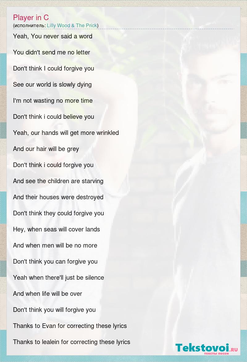 Yeah, You never said a word You didn't send me no letter Don't think I could forgive you See our world is slowly dying I'm not wasting no more time Don't think i could believe you Yeah, our hands will get more wrinkled And our hair will be grey Don't think i could forgive you And see the children are starving And their houses were destroyed Don't think they could forgive you Hey, when seas will cover lands And when men will be no more Don't think you can forgive you Yeah when there'll just be silence And when life will be over Don't think you will forgive you Thanks to Evan for correcting these lyrics Thanks to lealein for correcting these lyrics