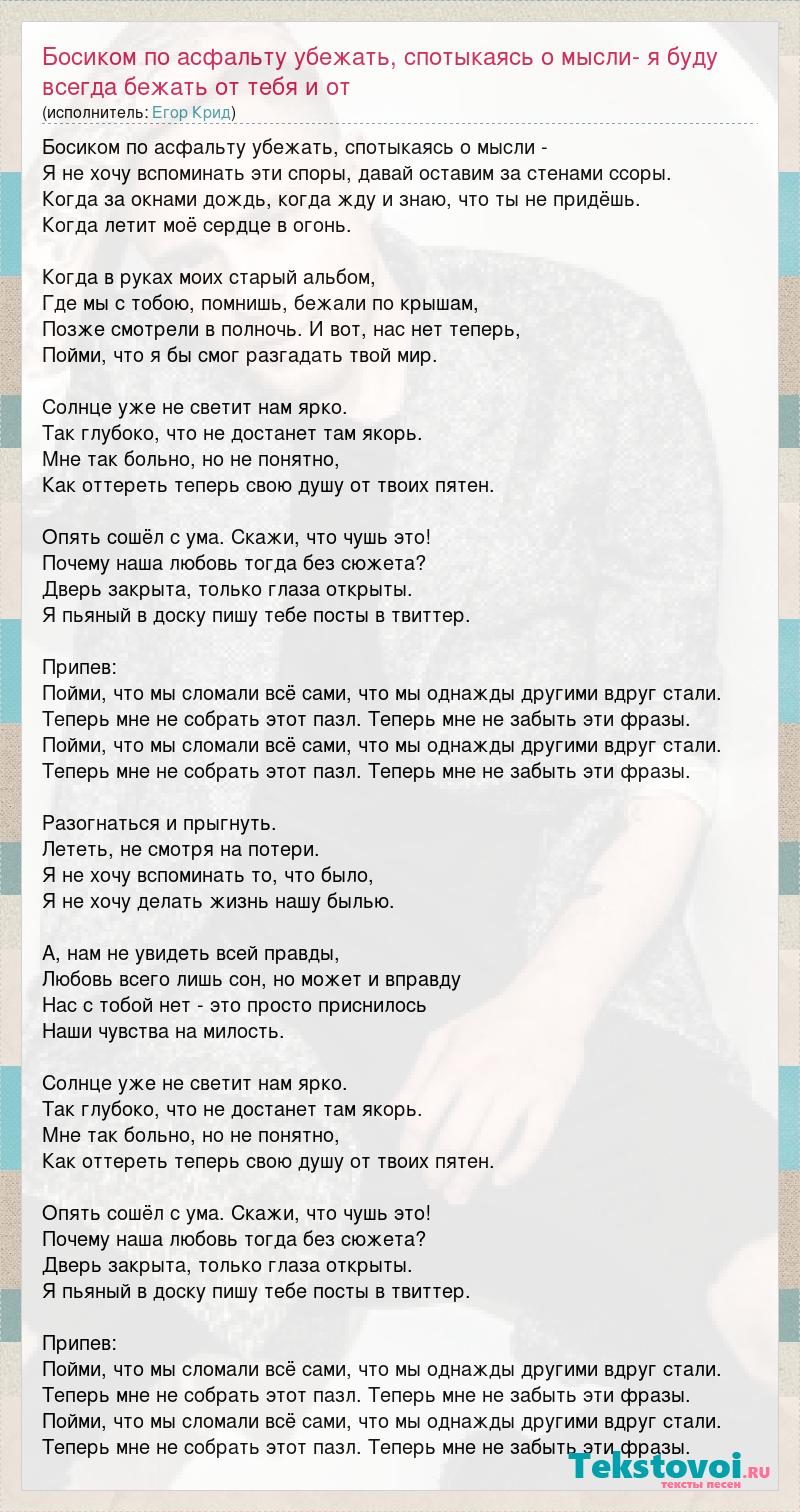 Главная→Исполнители→Егор Крид→Босиком по асфальту убежать, спотыкаясь о мысли- я буду всегда бежать от
