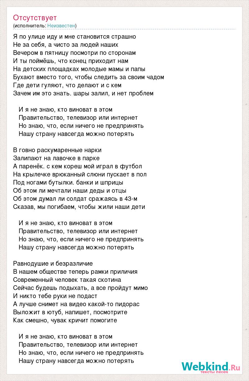 Я по улице иду и мне становится страшно Не за себя, а чисто за людей наших Вечером в пятницу посмотри по сторонам И ты поймёшь, что конец приходит нам На детских площадках молодые мамы и папы Бухают вместо того, чтобы следить за своим чадом Где дети гуляют, что делают и с кем Зачем им это знать. шары залил, и нет проблем И я не знаю, кто виноват в этом Правительство, телевизор или интернет Но знаю, что, если ничего не предпринять Нашу страну навсегда можно потерять В говно раскумаренные нарки Залипают на лавочке в парке А паренёк. с кем кореш мой играл в футбол На крылечке врюканный слюни пускает в пол Под ногами бутылки. банки и шприцы Об этом ли мечтали наши деды и отцы Об этом думал ли солдат сражаясь в 43-м Сказав, мы погибаем, чтобы жили наши дети И я не знаю, кто виноват в этом Правительство, телевизор или интернет Но знаю, что, если ничего не предпринять Нашу страну навсегда можно потерять Равнодушие и безразличие В нашем обществе теперь рамки приличия Современный человек такая скотина Сейчас будешь подыхать, а все пройдут мимо И никто тебе руки не подаст А лучше снимет на видео какой-то пидорас Выложит в ютуб, напишет, посмотрите Как смешно, чувак кричит помогите И я не знаю, кто виноват в этом Правительство, телевизор или интернет Но знаю, что, если ничего не предпринять Нашу страну навсегда можно потерять