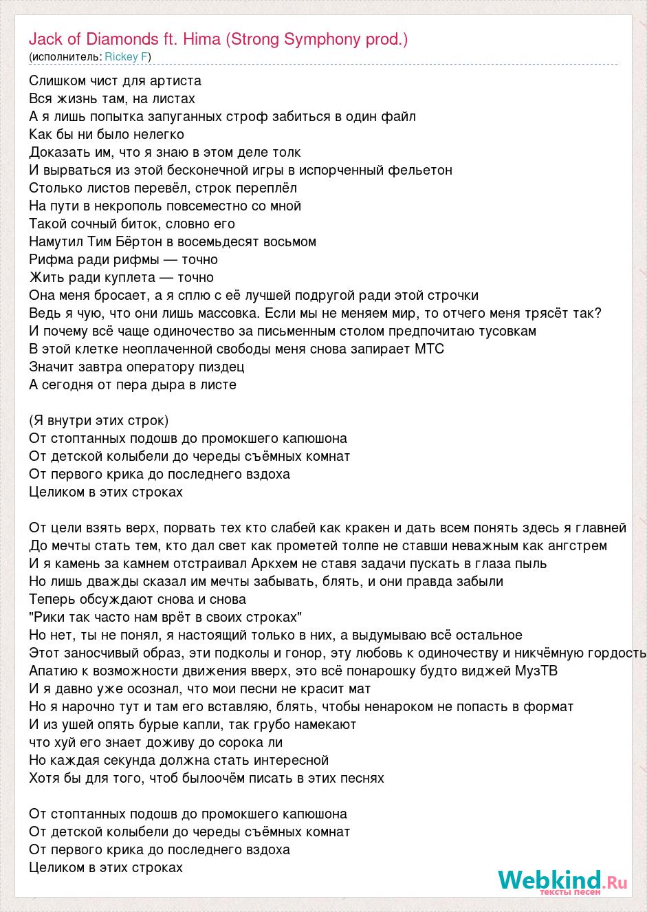 Слишком чист для артиста Вся жизнь там, на листах А я лишь попытка запуганных строф забиться в один файл Как бы ни было нелегко Доказать им, что я знаю в этом деле толк И вырваться из этой бесконечной игры в испорченный фельетон Столько листов перевёл, строк переплёл На пути в некрополь повсеместно со мной Такой сочный биток, словно его Намутил Тим Бёртон в восемьдесят восьмом Рифма ради рифмы — точно Жить ради куплета — точно Она меня бросает, а я сплю с её лучшей подругой ради этой строчки Ведь я чую, что они лишь массовка. Если мы не меняем мир, то отчего меня трясёт так? И почему всё чаще одиночество за письменным столом предпочитаю тусовкам В этой клетке неоплаченной свободы меня снова запирает МТС Значит завтра оператору пиздец А сегодня от пера дыра в листе (Я внутри этих строк) От стоптанных подошв до промокшего капюшона От детской колыбели до череды съёмных комнат От первого крика до последнего вздоха Целиком в этих строках От цели взять верх, порвать тех кто слабей как кракен и дать всем понять здесь я главней До мечты стать тем, кто дал свет как прометей толпе не ставши неважным как ангстрем И я камень за камнем отстраивал Аркхем не ставя задачи пускать в глаза пыль Но лишь дважды сказал им мечты забывать, блять, и они правда забыли Теперь обсуждают снова и снова "Рики так часто нам врёт в своих строках" Но нет, ты не понял, я настоящий только в них, а выдумываю всё остальное Этот заносчивый образ, эти подколы и гонор, эту любовь к одиночеству и никчёмную гордость Апатию к возможности движения вверх, это всё понарошку будто виджей МузТВ И я давно уже осознал, что мои песни не красит мат Но я нарочно тут и там его вставляю, блять, чтобы ненароком не попасть в формат И из ушей опять бурые капли, так грубо намекают что хуй его знает доживу до сорока ли Но каждая секунда должна стать интересной Хотя бы для того, чтоб былоочём писать в этих песнях От стоптанных подошв до промокшего капюшона От детской колыбели до череды съёмных комнат От первого крика до последнего вздоха Целиком в этих строках