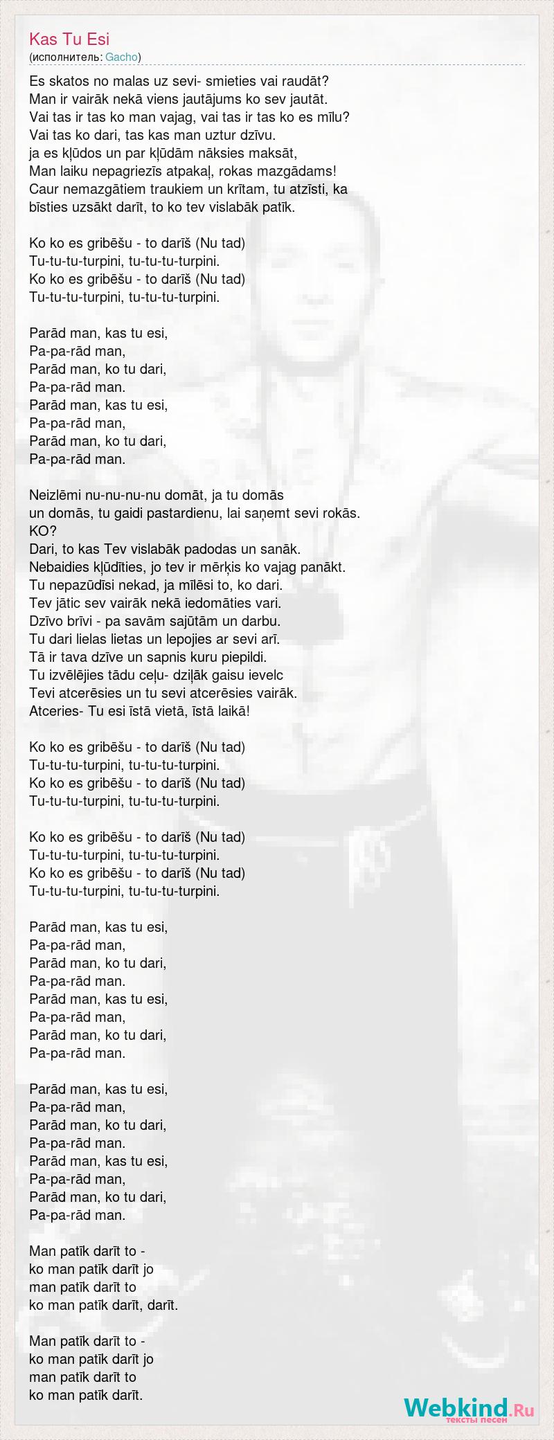 Es skatos no malas uz sevi- smieties vai raudāt? Man ir vairāk nekā viens jautājums ko sev jautāt. Vai tas ir tas ko man vajag, vai tas ir tas ko es mīlu? Vai tas ko dari, tas kas man uztur dzīvu. ja es kļūdos un par kļūdām nāksies maksāt, Man laiku nepagriezīs atpakaļ, rokas mazgādams! Caur nemazgātiem traukiem un krītam, tu atzīsti, ka bīsties uzsākt darīt, to ko tev vislabāk patīk. Ko ko es gribēšu - to darīš (Nu tad) Tu-tu-tu-turpini, tu-tu-tu-turpini. Ko ko es gribēšu - to darīš (Nu tad) Tu-tu-tu-turpini, tu-tu-tu-turpini. Parād man, kas tu esi, Pa-pa-rād man, Parād man, ko tu dari, Pa-pa-rād man. Parād man, kas tu esi, Pa-pa-rād man, Parād man, ko tu dari, Pa-pa-rād man. Neizlēmi nu-nu-nu-nu domāt, ja tu domās un domās, tu gaidi pastardienu, lai saņemt sevi rokās. KO? Dari, to kas Tev vislabāk padodas un sanāk. Nebaidies kļūdīties, jo tev ir mērķis ko vajag panākt. Tu nepazūdīsi nekad, ja mīlēsi to, ko dari. Tev jātic sev vairāk nekā iedomāties vari. Dzīvo brīvi - pa savām sajūtām un darbu. Tu dari lielas lietas un lepojies ar sevi arī. Tā ir tava dzīve un sapnis kuru piepildi. Tu izvēlējies tādu ceļu- dziļāk gaisu ievelc Tevi atcerēsies un tu sevi atcerēsies vairāk. Atceries- Tu esi īstā vietā, īstā laikā! Ko ko es gribēšu - to darīš (Nu tad) Tu-tu-tu-turpini, tu-tu-tu-turpini. Ko ko es gribēšu - to darīš (Nu tad) Tu-tu-tu-turpini, tu-tu-tu-turpini. Ko ko es gribēšu - to darīš (Nu tad) Tu-tu-tu-turpini, tu-tu-tu-turpini. Ko ko es gribēšu - to darīš (Nu tad) Tu-tu-tu-turpini, tu-tu-tu-turpini. Parād man, kas tu esi, Pa-pa-rād man, Parād man, ko tu dari, Pa-pa-rād man. Parād man, kas tu esi, Pa-pa-rād man, Parād man, ko tu dari, Pa-pa-rād man. Parād man, kas tu esi, Pa-pa-rād man, Parād man, ko tu dari, Pa-pa-rād man. Parād man, kas tu esi, Pa-pa-rād man, Parād man, ko tu dari, Pa-pa-rād man. Man patīk darīt to - ko man patīk darīt jo man patīk darīt to ko man patīk darīt, darīt. Man patīk darīt to - ko man patīk darīt jo man patīk darīt to ko man patīk darīt.