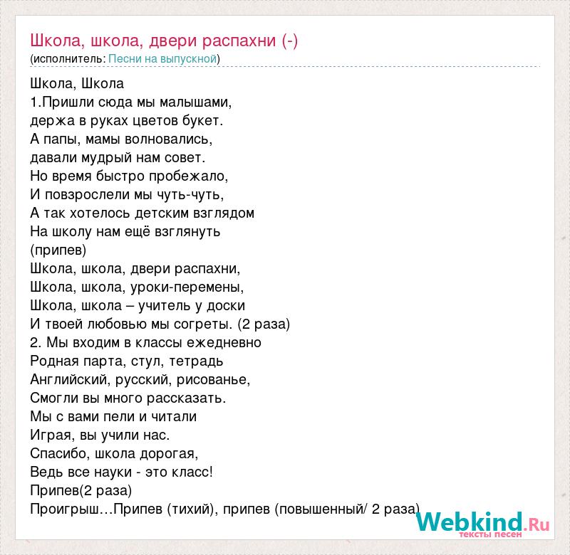 Школа, Школа 1.Пришли сюда мы малышами, держа в руках цветов букет. А папы, мамы волновались, давали мудрый нам совет. Но время быстро пробежало, И повзрослели мы чуть-чуть, А так хотелось детским взглядом На школу нам ещё взглянуть (припев) Школа, школа, двери распахни, Школа, школа, уроки-перемены, Школа, школа – учитель у доски И твоей любовью мы согреты. (2 раза) 2. Мы входим в классы ежедневно Родная парта, стул, тетрадь Английский, русский, рисованье, Смогли вы много рассказать. Мы с вами пели и читали Играя, вы учили нас. Спасибо, школа дорогая, Ведь все науки - это класс! Припев(2 раза) Проигрыш…Припев (тихий), припев (повышенный/ 2 раза)