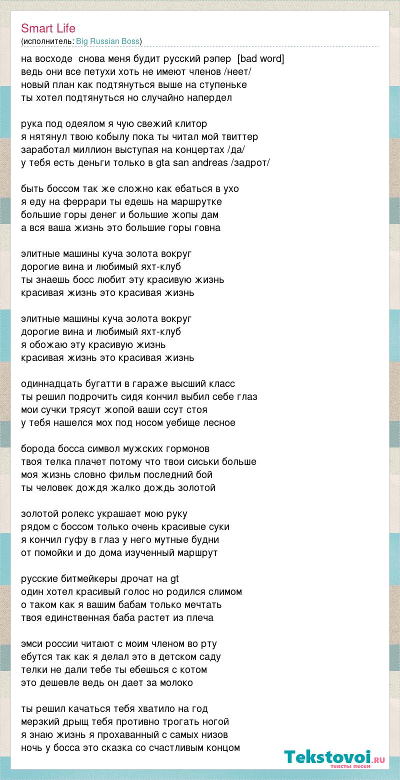 на восходе снова меня будит русский рэпер [bad word] ведь они все петухи хоть не имеют членов /неет/ новый план как подтянуться выше на ступеньке ты хотел подтянуться но случайно напердел рука под одеялом я чую свежий клитор я нятянул твою кобылу пока ты читал мой твиттер заработал миллион выступая на концертах /да/ у тебя есть деньги только в gta san andreas /задрот/ быть боссом так же сложно как ебаться в ухо я еду на феррари ты едешь на маршрутке большие горы денег и большие жопы дам а вся ваша жизнь это большие горы говна элитные машины куча золота вокруг дорогие вина и любимый яхт-клуб ты знаешь босс любит эту красивую жизнь красивая жизнь это красивая жизнь элитные машины куча золота вокруг дорогие вина и любимый яхт-клуб я обожаю эту красивую жизнь красивая жизнь это красивая жизнь одиннадцать бугатти в гараже высший класс ты решил подрочить сидя кончил выбил себе глаз мои сучки трясут жопой ваши ссут стоя у тебя нашелся мох под носом уебище лесное борода босса символ мужских гормонов твоя телка плачет потому что твои сиськи больше моя жизнь словно фильм последний бой ты человек дождя жалко дождь золотой золотой ролекс украшает мою руку рядом с боссом только очень красивые суки я кончил гуфу в глаз у него мутные будни от помойки и до дома изученный маршрут русские битмейкеры дрочат на gt один хотел красивый голос но родился слимом о таком как я вашим бабам только мечтать твоя единственная баба растет из плеча эмси россии читают с моим членом во рту ебутся так как я делал это в детском саду телки не дали тебе ты ебешься с котом это дешевле ведь он дает за молоко ты решил качаться тебя хватило на год мерзкий дрыщ тебя противно трогать ногой я знаю жизнь я прохаванный с самых низов ночь у босса это сказка со счастливым концом