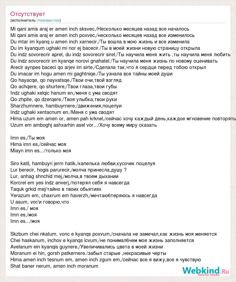 Mi qani amis araj er amen inch sksvec,/Несколько месяцев назад все началось Mi qani amis araj er amen inch poxvec,/несколько месяцев назад все изменилось Du mtar im kyanq u amen inch xarnecir,/Ты вошла в мою жизнь и все изменила Du im kyanqum ughaki mi nor ej bacecir./Ты в моей жизни новую страницу открыла Du indz sovorecrir aprel, du indz sovorecrir sirel,/Ты научила меня жить ,ты научила меня любить Du indz sovorecrir im kyanqe norovi gnahatel./Ты научила меня жизнь по новому оценивать Arecir aynpes baceci qo arjev im sirte,/Сделала так,что я сердце перед тобою открыл Du imacar im hogu amen mi gaghtniqe./Ты узнала все тайны моей души Qo hayacqe, qo nayvatsqe,/Твои очи,твой взгляд Qo achqere, qo shurtere,/Твои глаза,твои губы Indz ughaki xelqic hanum en,/меня с ума сводят Qo zhpite, qo dzerqere,/Твоя улыбка,твои руки Sharzhumnere, hambuyrnere,/движения,поцелуи Indz ughaki xentacnum en./Меня с ума сводят Hima uzum em amen or, amen pah krknel,/сейчас хочу каждый день,каждое мгновение повторять Uzum em amboghj ashxarhin asel vor.../Хочу всему миру сказать Imn es,/Ты моя Hima imn es,/сейчас моя Miayn imn es.../только моя Siro katil, hambuyri jerm hatik,/капелька любви,кусочек поцелуя Lur berecir, hogis parurecir,/молча принесла,душу ? Lur, anhag shnchid mej,/молча,в твоем дыхании Korcrel em yes indz anverj,/потерял себя я навсегда Taquk grkid mej/тайно в твоих обьятиях Yerazum em, chaxrum em haverzh,/мечтаю6теряюсь я навсегда U asum, vor/и говорю,что Imn es,/ моя Imn es,/моя Imn es.../моя Skzbum chei nkatum, vonc e kyanqs poxvum,/сначала не замечал,как жизнь моя меняется Chei haskanum, inchov e kyanqs lcvum,/не понимал6чем моя жизнь заполняется Avelanum ein kyanqis guynere,/Увеличивались цвета в моей жизни Moranum ei hin, gorsh patkernere./забыл старые ,некрасивые черты Hima amen inch tesnum em, amen inch zgum em,/сейчас все я вижу,все я чувствую Shat baner nerum, amen inch moranum