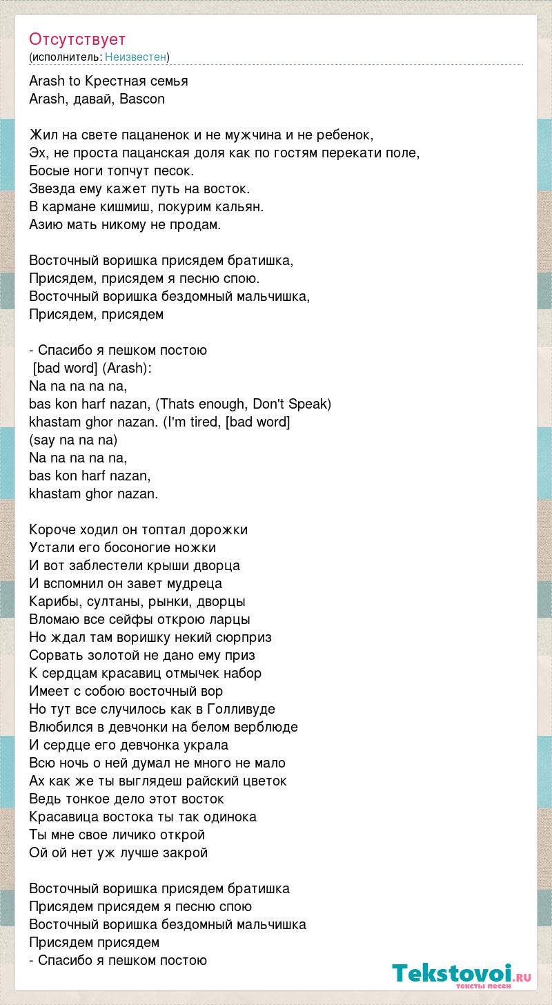 Arash to Крестная семья Arash, давай, Bascon Жил на свете пацаненок и не мужчина и не ребенок, Эх, не проста пацанская доля как по гостям перекати поле, Босые ноги топчут песок. Звезда ему кажет путь на восток. В кармане кишмиш, покурим кальян. Азию мать никому не продам. Восточный воришка присядем братишка, Присядем, присядем я песню спою. Восточный воришка бездомный мальчишка, Присядем, присядем - Спасибо я пешком постою Chorus (Arash): Na na na na na, bas kon harf nazan, (Thats enough, Don't Speak) khastam ghor nazan. (I'm tired, stop complaining) (say na na na) Na na na na na, bas kon harf nazan, khastam ghor nazan. Короче ходил он топтал дорожки Устали его босоногие ножки И вот заблестели крыши дворца И вспомнил он завет мудреца Карибы, султаны, рынки, дворцы Вломаю все сейфы открою ларцы Но ждал там воришку некий сюрприз Сорвать золотой не дано ему приз К сердцам красавиц отмычек набор Имеет с собою восточный вор Но тут все случилось как в Голливуде Влюбился в девчонки на белом верблюде И сердце его девчонка украла Всю ночь о ней думал не много не мало Ах как же ты выглядеш райский цветок Ведь тонкое дело этот восток Красавица востока ты так одинока Ты мне свое личико открой Ой ой нет уж лучше закрой Восточный воришка присядем братишка Присядем присядем я песню спою Восточный воришка бездомный мальчишка Присядем присядем - Спасибо я пешком постою