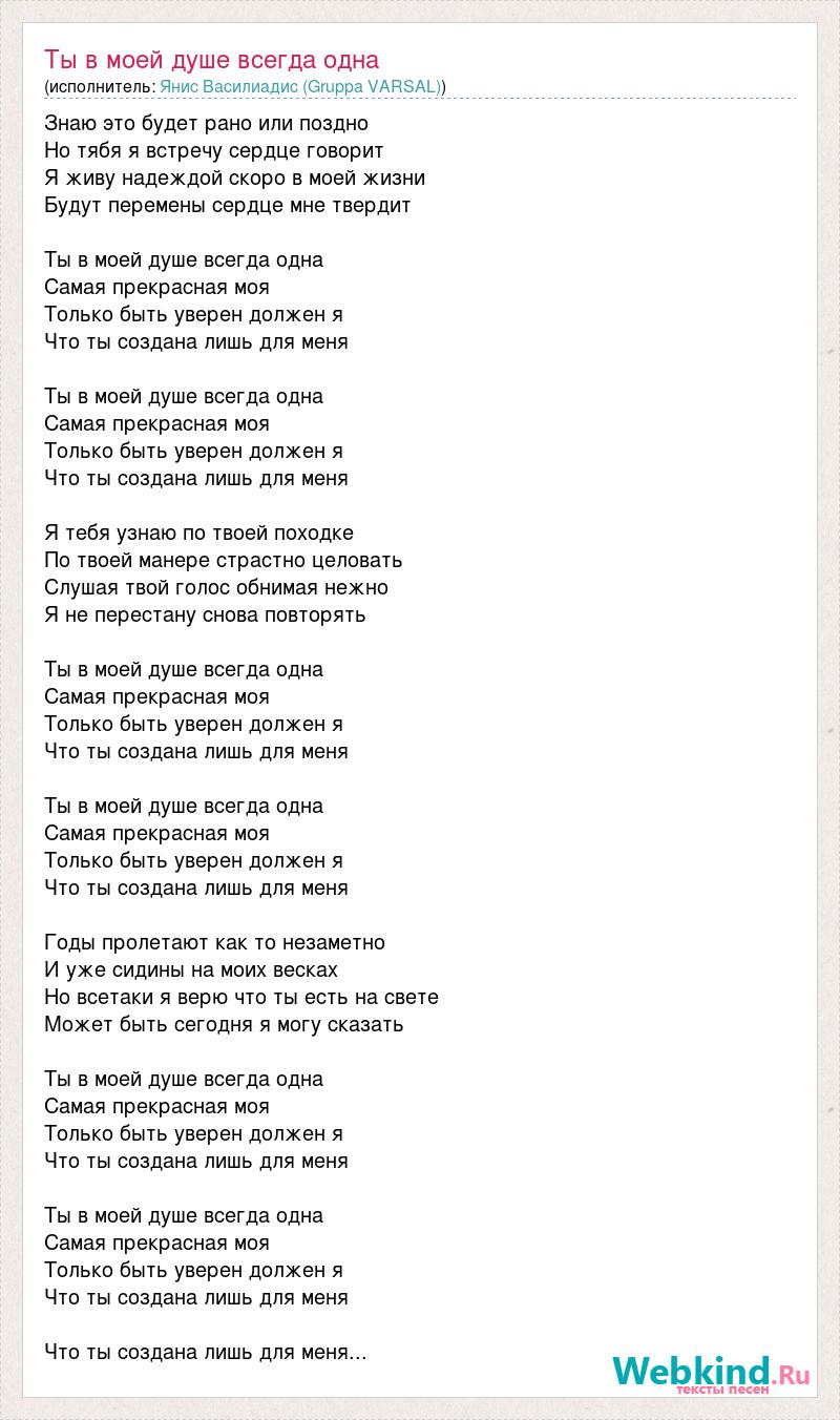 Знаю это будет рано или поздно Но тябя я встречу сердце говорит Я живу надеждой скоро в моей жизни Будут перемены сердце мне твердит Ты в моей душе всегда одна Самая прекрасная моя Только быть уверен должен я Что ты создана лишь для меня Ты в моей душе всегда одна Самая прекрасная моя Только быть уверен должен я Что ты создана лишь для меня Я тебя узнаю по твоей походке По твоей манере страстно целовать Слушая твой голос обнимая нежно Я не перестану снова повторять Ты в моей душе всегда одна Самая прекрасная моя Только быть уверен должен я Что ты создана лишь для меня Ты в моей душе всегда одна Самая прекрасная моя Только быть уверен должен я Что ты создана лишь для меня Годы пролетают как то незаметно И уже сидины на моих весках Но всетаки я верю что ты есть на свете Может быть сегодня я могу сказать Ты в моей душе всегда одна Самая прекрасная моя Только быть уверен должен я Что ты создана лишь для меня Ты в моей душе всегда одна Самая прекрасная моя Только быть уверен должен я Что ты создана лишь для меня Что ты создана лишь для меня...