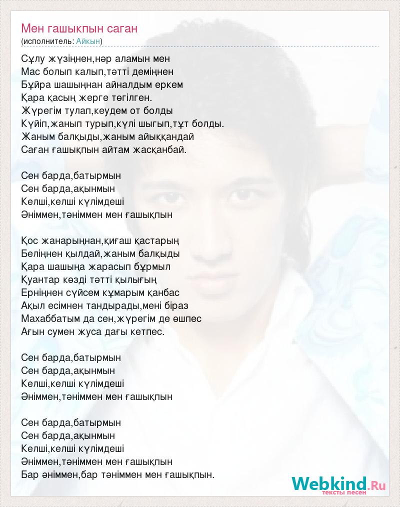 Сұлу жүзіңнен,нәр аламын мен Мас болып калып,тәтті деміңнен Бұйра шашыңнан айналдым еркем Қара қасың жерге төгілген. Жүрегім тулап,кеудем от болды Күйіп,жанып турып,күлі шыгып,тұт болды. Жаным балқыды,жаным айыққандай Саған ғашықпын айтам жасқанбай. Сен барда,батырмын Сен барда,ақынмын Келші,келші күлімдеші Әніммен,тәніммен мен ғашықпын Қос жанарыңнан,қиғаш қастарың Беліңнен қылдай,жаным балқыды Қара шашыңа жарасып бұрмыл Қуантар көзді тәтті қылығың Ерніңнен сүйсем кұмарым қанбас Ақыл есімнен тандырады,мені біраз Махаббатым да сен,жүрегім де өшпес Ағын сумен жуса дағы кетпес. Сен барда,батырмын Сен барда,ақынмын Келші,келші күлімдеші Әніммен,тәніммен мен ғашықпын Сен барда,батырмын Сен барда,ақынмын Келші,келші күлімдеші Әніммен,тәніммен мен ғашықпын Бар әніммен,бар тәніммен мен ғашықпын.