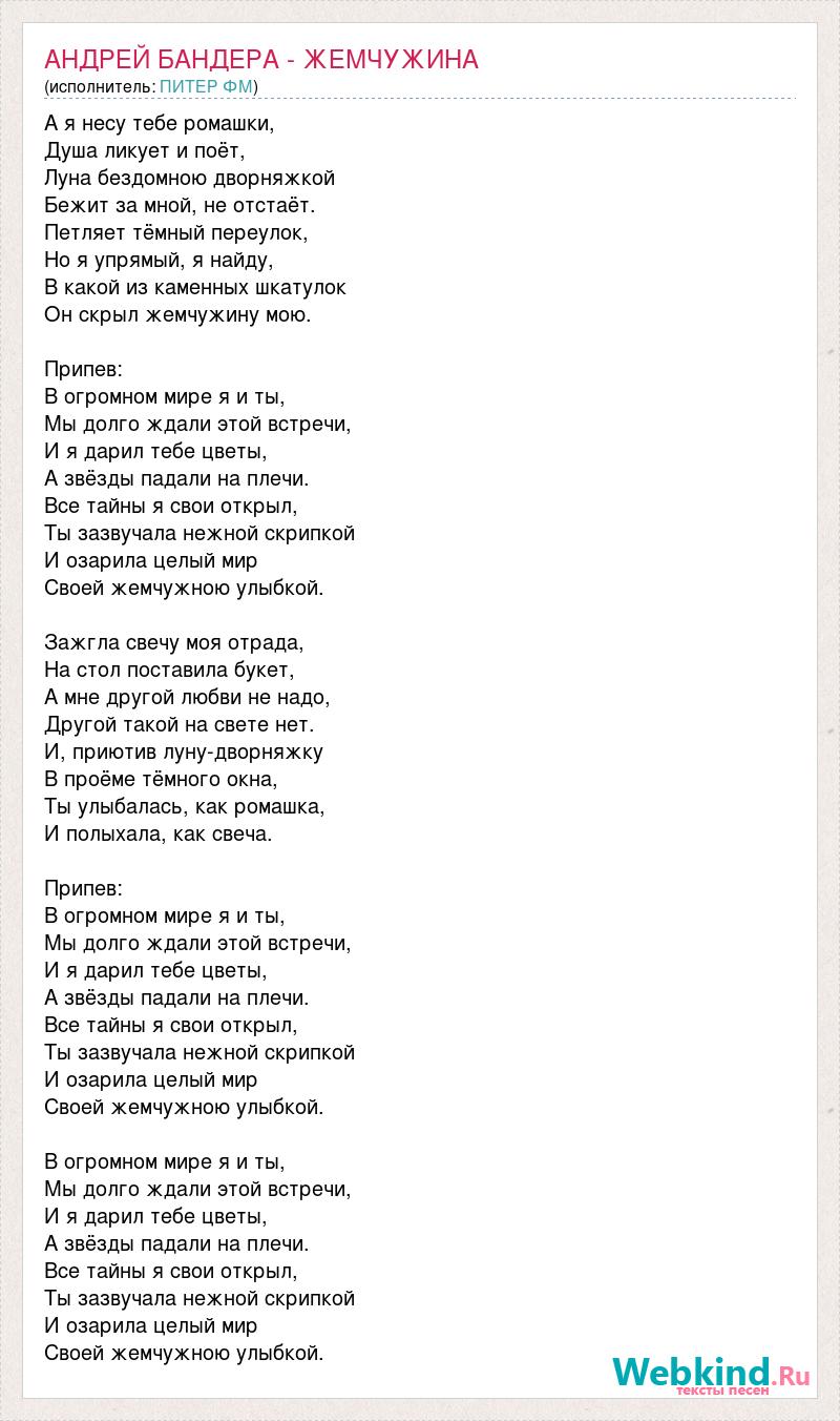 А я несу тебе ромашки, Душа ликует и поёт, Луна бездомною дворняжкой Бежит за мной, не отстаёт. Петляет тёмный переулок, Но я упрямый, я найду, В какой из каменных шкатулок Он скрыл жемчужину мою. Припев: В огромном мире я и ты, Мы долго ждали этой встречи, И я дарил тебе цветы, А звёзды падали на плечи. Все тайны я свои открыл, Ты зазвучала нежной скрипкой И озарила целый мир Своей жемчужною улыбкой. Зажгла свечу моя отрада, На стол поставила букет, А мне другой любви не надо, Другой такой на свете нет. И, приютив луну-дворняжку В проёме тёмного окна, Ты улыбалась, как ромашка, И полыхала, как свеча. Припев: В огромном мире я и ты, Мы долго ждали этой встречи, И я дарил тебе цветы, А звёзды падали на плечи. Все тайны я свои открыл, Ты зазвучала нежной скрипкой И озарила целый мир Своей жемчужною улыбкой. В огромном мире я и ты, Мы долго ждали этой встречи, И я дарил тебе цветы, А звёзды падали на плечи. Все тайны я свои открыл, Ты зазвучала нежной скрипкой И озарила целый мир Своей жемчужною улыбкой.