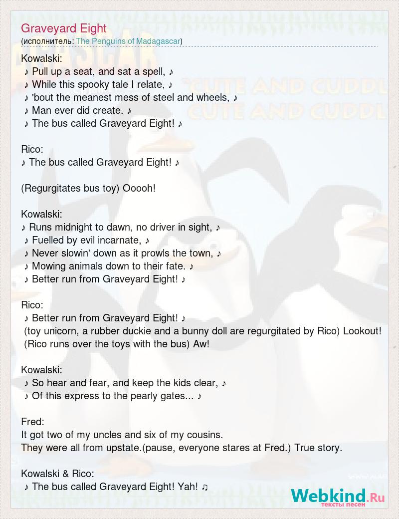 Kowalski: ♪ Pull up a seat, and sat a spell, ♪ ♪ While this spooky tale I relate, ♪ ♪ 'bout the meanest mess of steel and wheels, ♪ ♪ Man ever did create. ♪ ♪ The bus called Graveyard Eight! ♪ Rico: ♪ The bus called Graveyard Eight! ♪ (Regurgitates bus toy) Ooooh! Kowalski: ♪ Runs midnight to dawn, no driver in sight, ♪ ♪ Fuelled by evil incarnate, ♪ ♪ Never slowin' down as it prowls the town, ♪ ♪ Mowing animals down to their fate. ♪ ♪ Better run from Graveyard Eight! ♪ Rico: ♪ Better run from Graveyard Eight! ♪ (toy unicorn, a rubber duckie and a bunny doll are regurgitated by Rico) Lookout! (Rico runs over the toys with the bus) Aw! Kowalski: ♪ So hear and fear, and keep the kids clear, ♪ ♪ Of this express to the pearly gates... ♪ Fred: It got two of my uncles and six of my cousins. They were all from upstate.(pause, everyone stares at Fred.) True story. Kowalski & Rico: ♪ The bus called Graveyard Eight! Yah! ♫