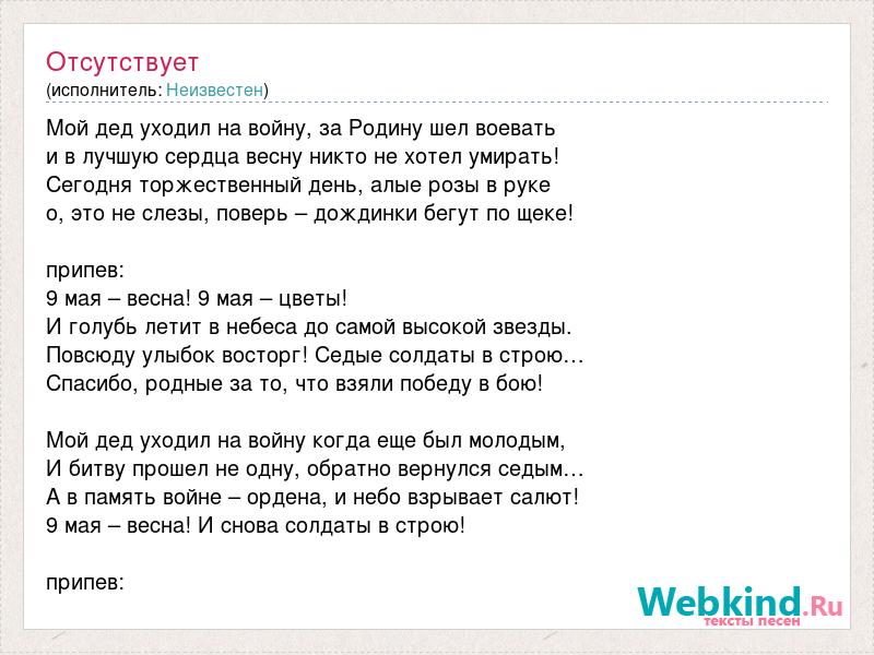 Мой дед уходил на войну, за Родину шел воевать и в лучшую сердца весну никто не хотел умирать! Сегодня торжественный день, алые розы в руке о, это не слезы, поверь – дождинки бегут по щеке! припев: 9 мая – весна! 9 мая – цветы! И голубь летит в небеса до самой высокой звезды. Повсюду улыбок восторг! Седые солдаты в строю… Спасибо, родные за то, что взяли победу в бою! Мой дед уходил на войну когда еще был молодым, И битву прошел не одну, обратно вернулся седым… А в память войне – ордена, и небо взрывает салют! 9 мая – весна! И снова солдаты в строю! припев: