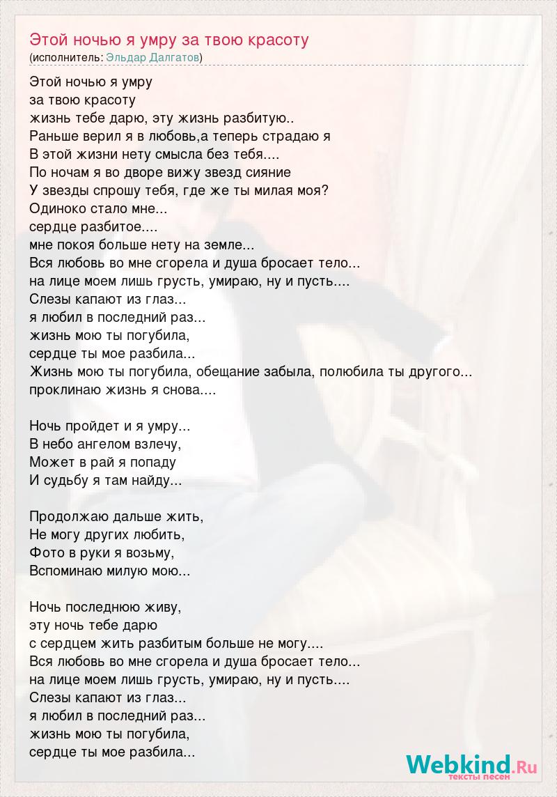 Этой ночью я умру за твою красоту жизнь тебе дарю, эту жизнь разбитую.. Раньше верил я в любовь,а теперь страдаю я В этой жизни нету смысла без тебя.... По ночам я во дворе вижу звезд сияние У звезды спрошу тебя, где же ты милая моя? Одиноко стало мне... сердце разбитое.... мне покоя больше нету на земле... Вся любовь во мне сгорела и душа бросает тело... на лице моем лишь грусть, умираю, ну и пусть.... Слезы капают из глаз... я любил в последний раз... жизнь мою ты погубила, сердце ты мое разбила... Жизнь мою ты погубила, обещание забыла, полюбила ты другого... проклинаю жизнь я снова.... Ночь пройдет и я умру... В небо ангелом взлечу, Может в рай я попаду И судьбу я там найду... Продолжаю дальше жить, Не могу других любить, Фото в руки я возьму, Вспоминаю милую мою... Ночь последнюю живу, эту ночь тебе дарю с сердцем жить разбитым больше не могу.... Вся любовь во мне сгорела и душа бросает тело... на лице моем лишь грусть, умираю, ну и пусть.... Слезы капают из глаз... я любил в последний раз... жизнь мою ты погубила, сердце ты мое разбила...