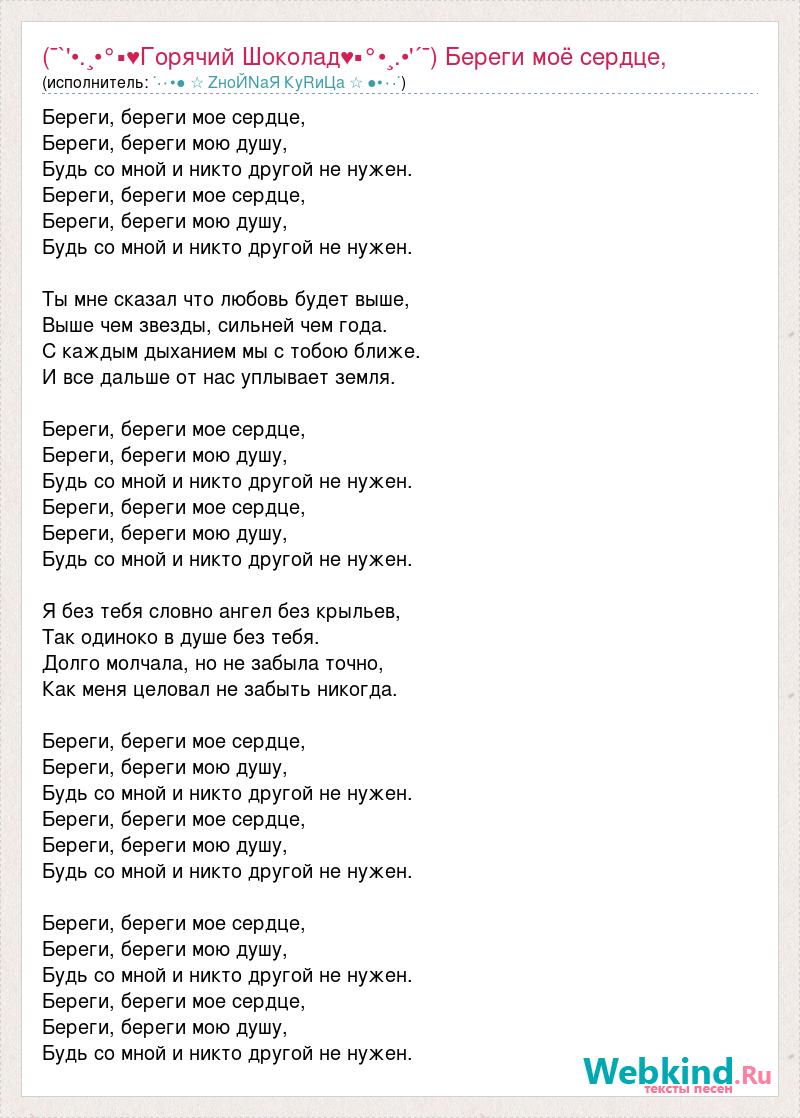 Береги, береги мое сердце, Береги, береги мою душу, Будь со мной и никто другой не нужен. Береги, береги мое сердце, Береги, береги мою душу, Будь со мной и никто другой не нужен. Ты мне сказал что любовь будет выше, Выше чем звезды, сильней чем года. С каждым дыханием мы с тобою ближе. И все дальше от нас уплывает земля. Береги, береги мое сердце, Береги, береги мою душу, Будь со мной и никто другой не нужен. Береги, береги мое сердце, Береги, береги мою душу, Будь со мной и никто другой не нужен. Я без тебя словно ангел без крыльев, Так одиноко в душе без тебя. Долго молчала, но не забыла точно, Как меня целовал не забыть никогда. Береги, береги мое сердце, Береги, береги мою душу, Будь со мной и никто другой не нужен. Береги, береги мое сердце, Береги, береги мою душу, Будь со мной и никто другой не нужен. Береги, береги мое сердце, Береги, береги мою душу, Будь со мной и никто другой не нужен. Береги, береги мое сердце, Береги, береги мою душу, Будь со мной и никто другой не нужен.