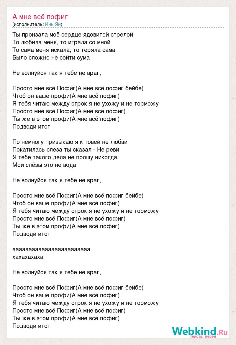 Ты пронзала моё сердце ядовитой стрелой То любила меня, то играла со мной То сама меня искала, то теряла сама Было сложно не сойти сума Не волнуйся так я тебе не враг, Просто мне всё Пофиг(А мне всё пофиг бейбе) Чтоб он ваше профи(А мне всё пофиг) Я тебя читаю между строк я не ухожу и не торможу Просто мне всё Пофиг(А мне всё пофиг) Ты же в этом профи(А мне всё пофиг) Подводи итог По немногу привыкаю я к товей не любви Покатилась слеза ты сказал - Не реви Я тебе такого дела не прощу никогда Мои слёзы это не вода Не волнуйся так я тебе не враг, Просто мне всё Пофиг(А мне всё пофиг бейбе) Чтоб он ваше профи(А мне всё пофиг) Я тебя читаю между строк я не ухожу и не торможу Просто мне всё Пофиг(А мне всё пофиг) Ты же в этом профи(А мне всё пофиг) Подводи итог аааааааааааааааааааааааа хахахахаха Не волнуйся так я тебе не враг, Просто мне всё Пофиг(А мне всё пофиг бейбе) Чтоб он ваше профи(А мне всё пофиг) Я тебя читаю между строк я не ухожу и не торможу Просто мне всё Пофиг(А мне всё пофиг) Ты же в этом профи(А мне всё пофиг) Подводи итог
