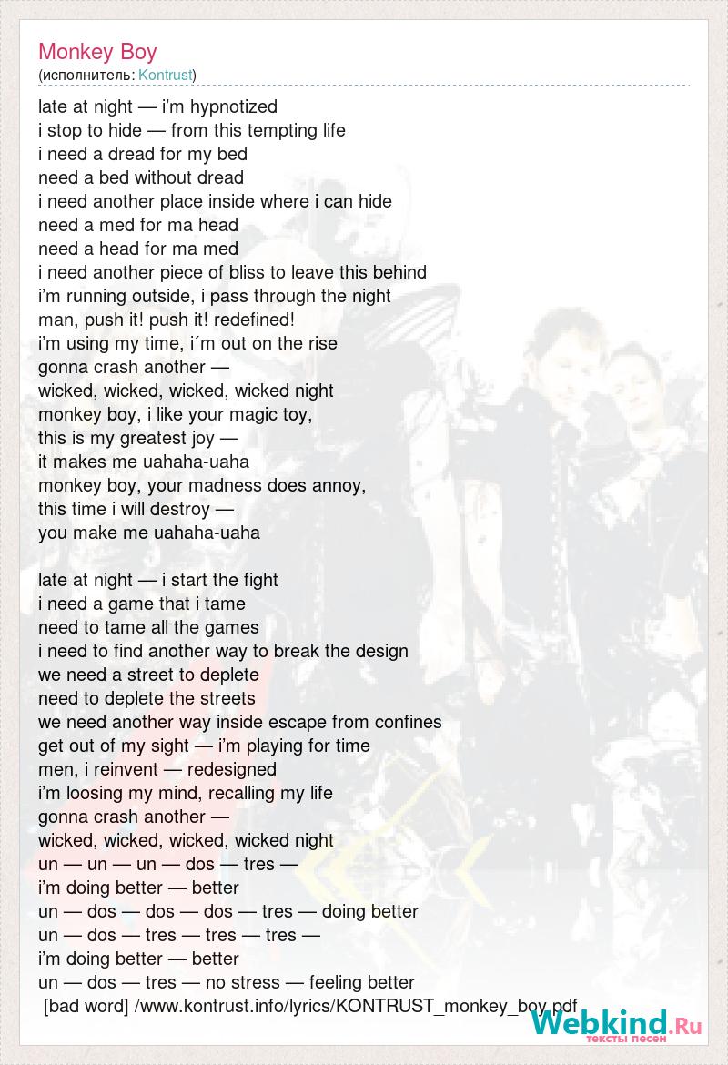 late at night — i’m hypnotized i stop to hide — from this tempting life i need a dread for my bed need a bed without dread i need another place inside where i can hide need a med for ma head need a head for ma med i need another piece of bliss to leave this behind i’m running outside, i pass through the night man, push it! push it! redefined! i’m using my time, i´m out on the rise gonna crash another — wicked, wicked, wicked, wicked night monkey boy, i like your magic toy, this is my greatest joy — it makes me uahaha-uaha monkey boy, your madness does annoy, this time i will destroy — you make me uahaha-uaha late at night — i start the fight i need a game that i tame need to tame all the games i need to find another way to break the design we need a street to deplete need to deplete the streets we need another way inside escape from confines get out of my sight — i’m playing for time men, i reinvent — redesigned i’m loosing my mind, recalling my life gonna crash another — wicked, wicked, wicked, wicked night un — un — un — dos — tres — i’m doing better — better un — dos — dos — dos — tres — doing better un — dos — tres — tres — tres — i’m doing better — better un — dos — tres — no stress — feeling better [bad word] /www.kontrust.info/lyrics/KONTRUST_monkey_boy.pdf