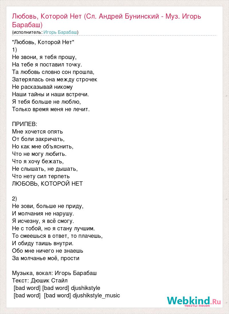 "Любовь, Которой Нет" 1) Не звони, я тебя прошу, На тебе я поставил точку. Та любовь словно сон прошла, Затерялась она между строчек Не расказывай никому Наши тайны и наши встречи. Я тебя больше не люблю, Только время меня не лечит. ПРИПЕВ: Мне хочется опять От боли закричать, Но как мне объяснить, Что не могу любить. Что я хочу бежать, Не слышать, не дышать, Что нету сил терпеть ЛЮБОВЬ, КОТОРОЙ НЕТ 2) Не зови, больше не приду, И молчания не нарушу. Я исчезну, я всё смогу. Не с тобой, но я стану лучшим. То смеешься в ответ, то плачешь, И обиду таишь внутри. Обо мне ничего не знаешь За молчанье моё, прости Музыка, вокал: Игорь Барабаш Текст: Дюшик Стайл [bad word] [bad word] djushikstyle [bad word] [bad word] djushikstyle_music