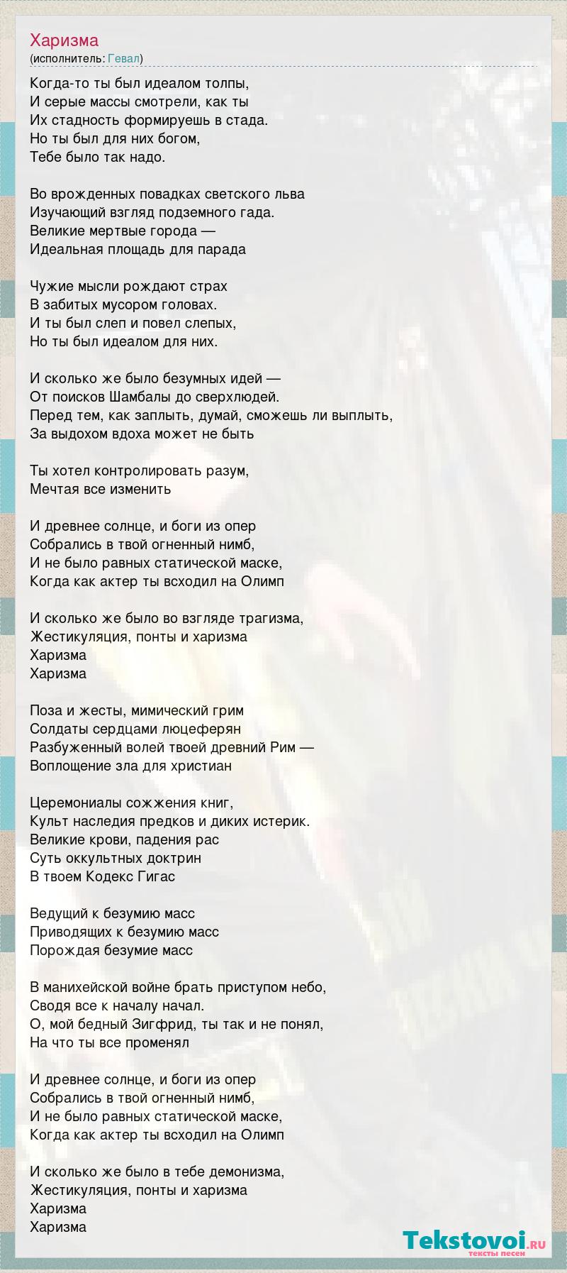 Когда-то ты был идеалом толпы, И серые массы смотрели, как ты Их стадность формируешь в стада. Но ты был для них богом, Тебе было так надо. Во врожденных повадках светского льва Изучающий взгляд подземного гада. Великие мертвые города — Идеальная площадь для парада Чужие мысли рождают страх В забитых мусором головах. И ты был слеп и повел слепых, Но ты был идеалом для них. И сколько же было безумных идей — От поисков Шамбалы до сверхлюдей. Перед тем, как заплыть, думай, сможешь ли выплыть, За выдохом вдоха может не быть Ты хотел контролировать разум, Мечтая все изменить И древнее солнце, и боги из опер Собрались в твой огненный нимб, И не было равных статической маске, Когда как актер ты всходил на Олимп И сколько же было во взгляде трагизма, Жестикуляция, понты и харизма Харизма Харизма Поза и жесты, мимический грим Солдаты сердцами люцеферян Разбуженный волей твоей древний Рим — Воплощение зла для христиан Церемониалы сожжения книг, Культ наследия предков и диких истерик. Великие крови, падения рас Суть оккультных доктрин В твоем Кодекс Гигас Ведущий к безумию масс Приводящих к безумию масс Порождая безумие масс В манихейской войне брать приступом небо, Сводя все к началу начал. О, мой бедный Зигфрид, ты так и не понял, На что ты все променял И древнее солнце, и боги из опер Собрались в твой огненный нимб, И не было равных статической маске, Когда как актер ты всходил на Олимп И сколько же было в тебе демонизма, Жестикуляция, понты и харизма Харизма Харизма