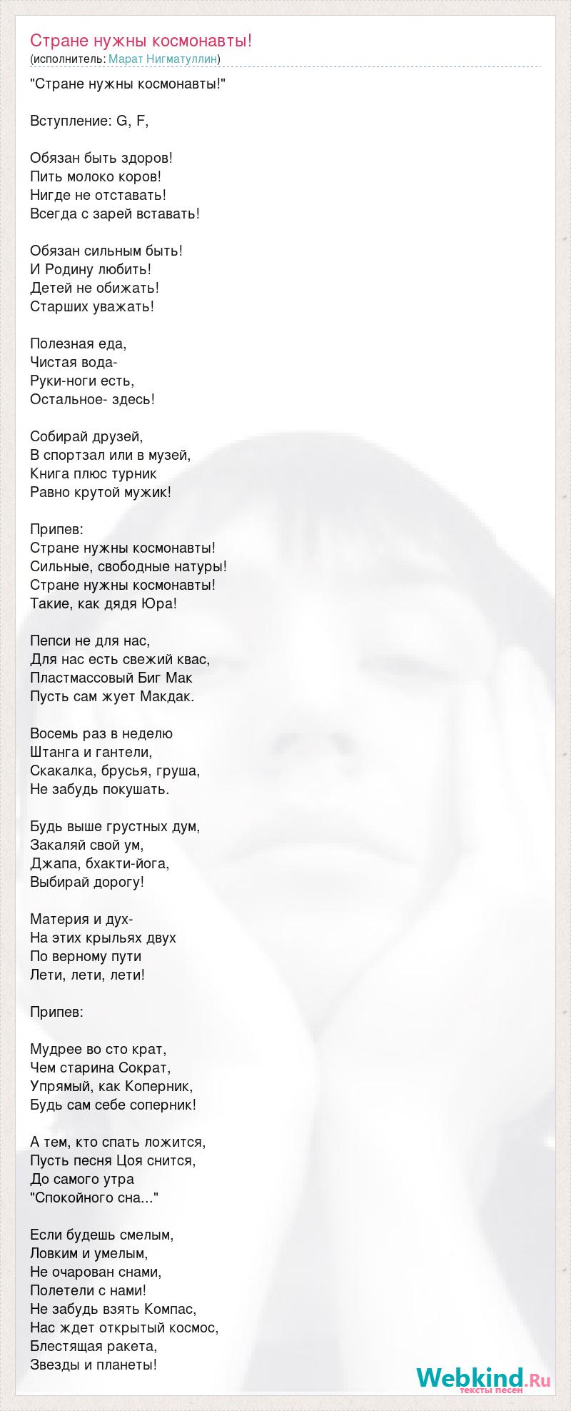 "Стране нужны космонавты!" Вступление: G, F, Обязан быть здоров! Пить молоко коров! Нигде не отставать! Всегда с зарей вставать! Обязан сильным быть! И Родину любить! Детей не обижать! Старших уважать! Полезная еда, Чистая вода- Руки-ноги есть, Остальное- здесь! Собирай друзей, В спортзал или в музей, Книга плюс турник Равно крутой мужик! Припев: Стране нужны космонавты! Сильные, свободные натуры! Стране нужны космонавты! Такие, как дядя Юра! Пепси не для нас, Для нас есть свежий квас, Пластмассовый Биг Мак Пусть сам жует Макдак. Восемь раз в неделю Штанга и гантели, Скакалка, брусья, груша, Не забудь покушать. Будь выше грустных дум, Закаляй свой ум, Джапа, бхакти-йога, Выбирай дорогу! Материя и дух- На этих крыльях двух По верному пути Лети, лети, лети! Припев: Мудрее во сто крат, Чем старина Сократ, Упрямый, как Коперник, Будь сам себе соперник! А тем, кто спать ложится, Пусть песня Цоя снится, До самого утра "Спокойного сна..." Если будешь смелым, Ловким и умелым, Не очарован снами, Полетели с нами! Не забудь взять Компас, Нас ждет открытый космос, Блестящая ракета, Звезды и планеты!